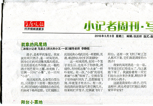 平原晚报:河师大附小学生马显之作文《我家的凤尾鸽》