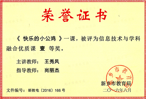我校王秀凤老师荣获新乡市教育局信息技术与学科融合优质课一等奖