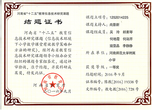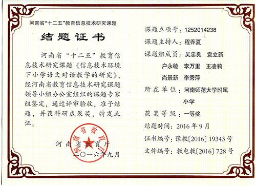 2016年9月,我校程乔夏书记主持的《信息技术环境下小学语文对话教学的研究》、尚景新老师主持的《信息技术环境下小学数学课堂有效教学策略和方法的研究》两项省“十二五”教育信息技术研究课题,均通过省信息技术课题领导小组办公室组织的评审验收,准予结题,并获得省科研成果一等奖。