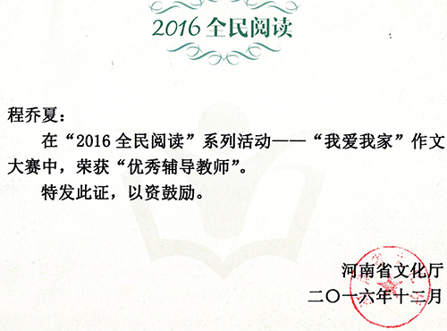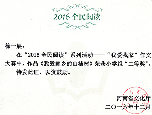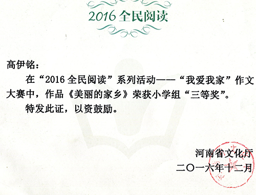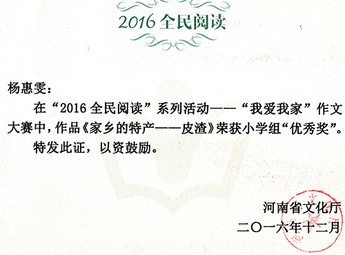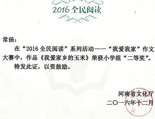 在河南省文化厅举办“2016全民阅读”系列活动——“我爱我家”作文大赛中,我校四一班学生常扬的作品《我爱家乡的玉米》、徐一展的作品《我爱家乡的山楂树》荣获小学组二等奖;高伊铭的作品《美丽的家乡》荣获三等奖;杨惠雯的作品《家乡的特产——皮渣》荣获优秀奖。四一班语文老师程乔夏被评为“优秀辅导教师”。