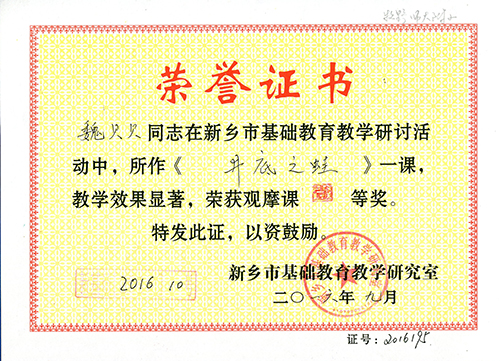 2016年9月,在新乡市基础教育教学研讨活动中,我校年轻老师魏贝贝所作的《井底之蛙》一课,教学效果显著,荣获市观摩课一等奖。