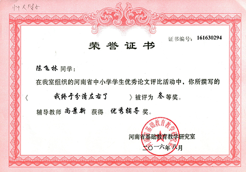 2016年8月,在河南省基础教研室组织的中小学学生优秀论文评比活动中,我校尚景新老师辅导学生周一瑾、周一琳同学撰写的论文《划!划!划!轻松学习3的倍数》被评为省级一等奖,陈飞林同学撰写论文的《我终于分清左右了》被评为省级三等奖。同时,尚景新老师获得优秀辅导奖。