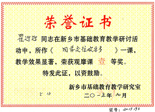我校翟莹莹老师在新乡市基础教育教学研讨活动中,所作《同学交往欢乐多》一课,教学效果显著,荣获观摩课一等奖。