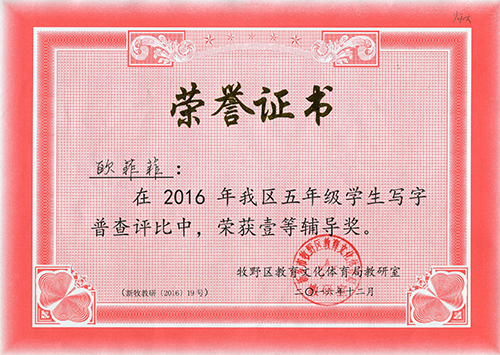 我校欧菲菲老师在2016年牧野区五年级学生写字普查评比中,荣获一等辅导奖。