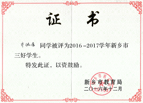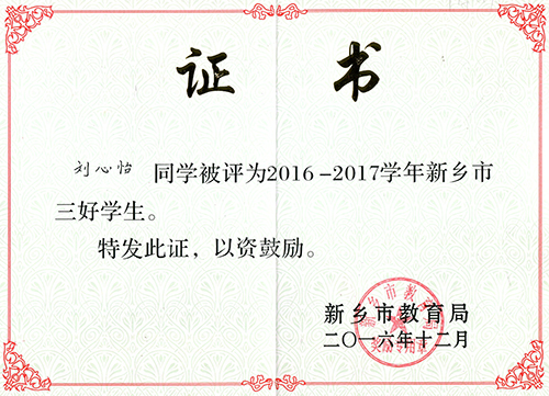 我校刘心怡、齐涵蓓两位同学被新乡市教育局评为2016—2017学年新乡市三好学生。