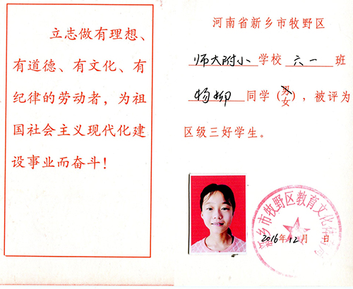 我校杨柳、薛彬、闫紫颖、程续、袁新宇、崔金硕、诗文玉、杜云天,八位同学被新乡市牧野区教育文化体育局评为区级三好学生。