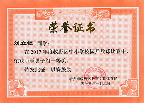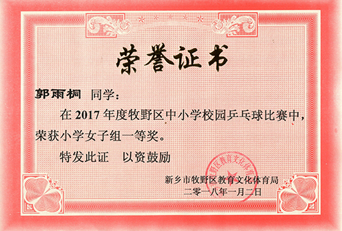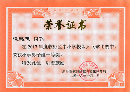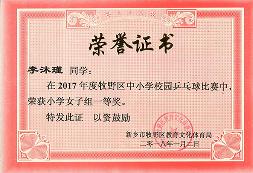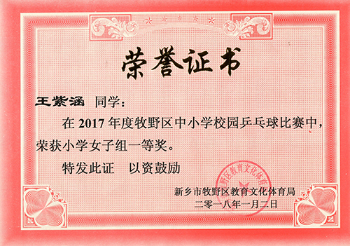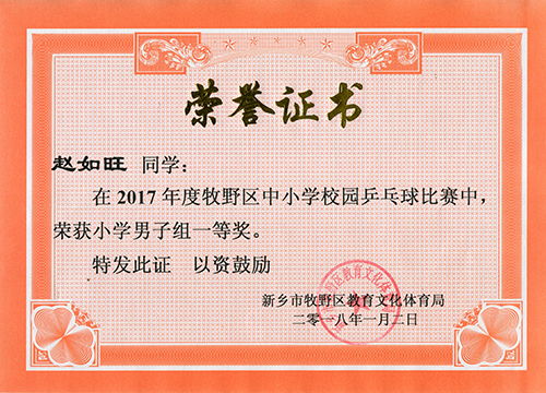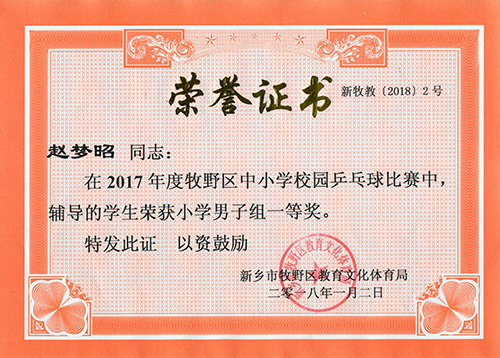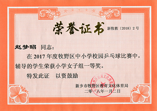 12月26日——12月28日,“牧野区2017年中小学校园乒乓球比赛”在牧野区实验小学拉开了帷幕。本次比赛共有来自牧野区41所中小学校的400多名学生参加。经过我校体育教师赵梦昭的严格训练,在比赛过程中,运动员们积极拼搏,发扬不到最后一刻决不放弃的精神,最终荣获牧野区男女乒乓球比赛一等奖。
