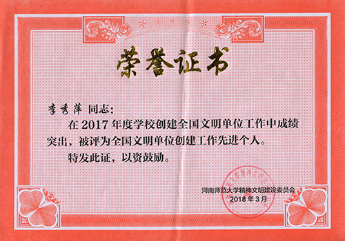 我校李秀萍老师被评为全国文明单位创建工作先进个人