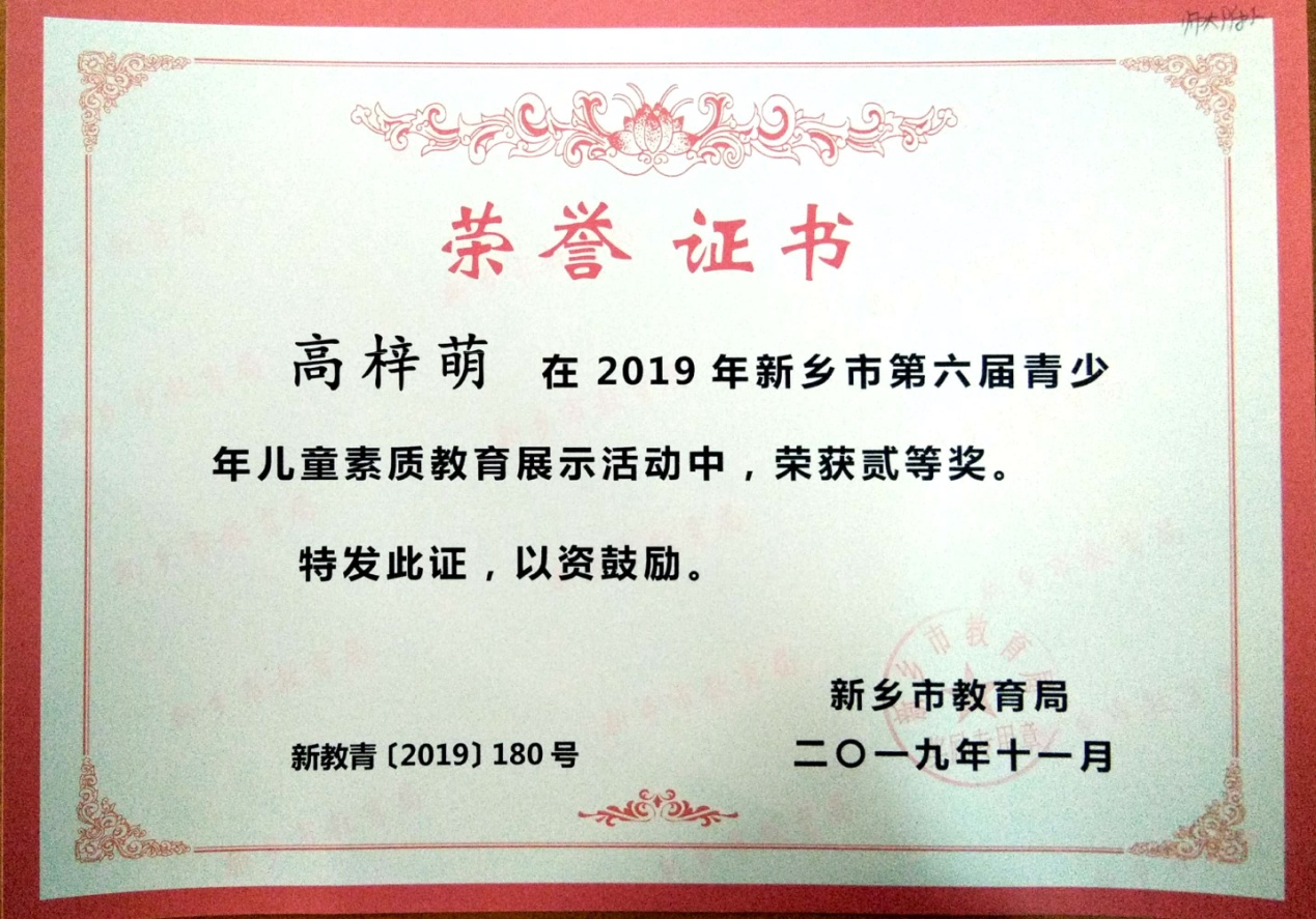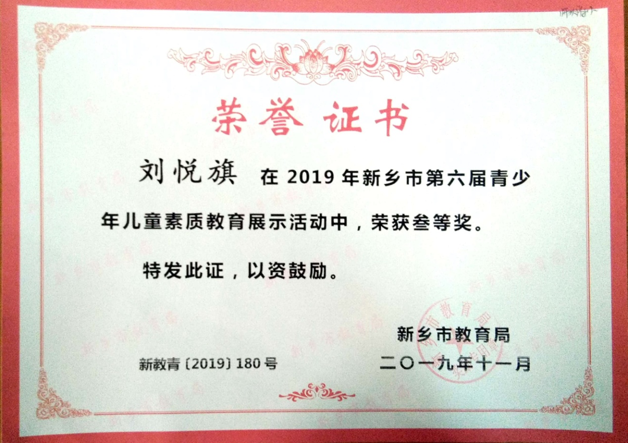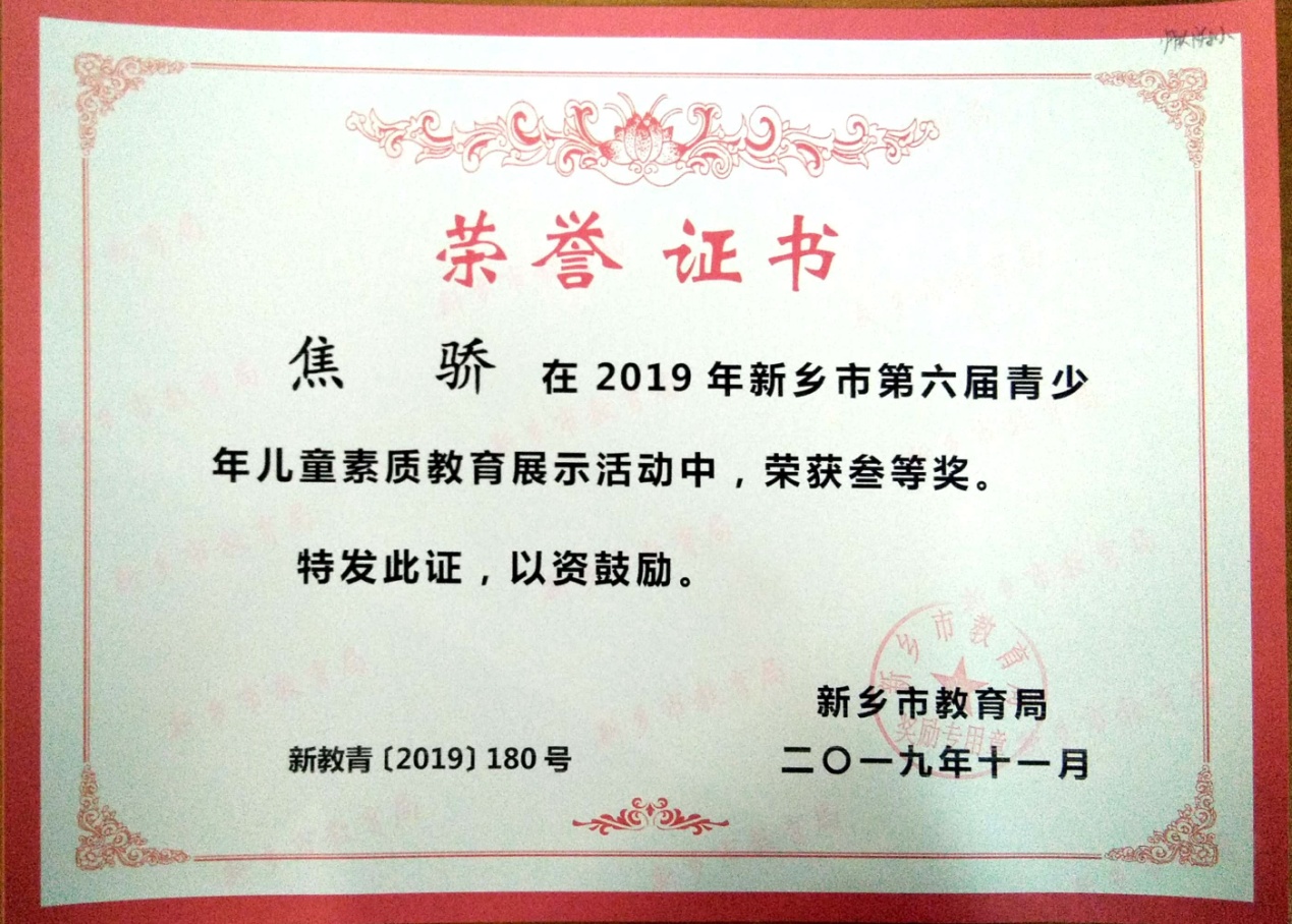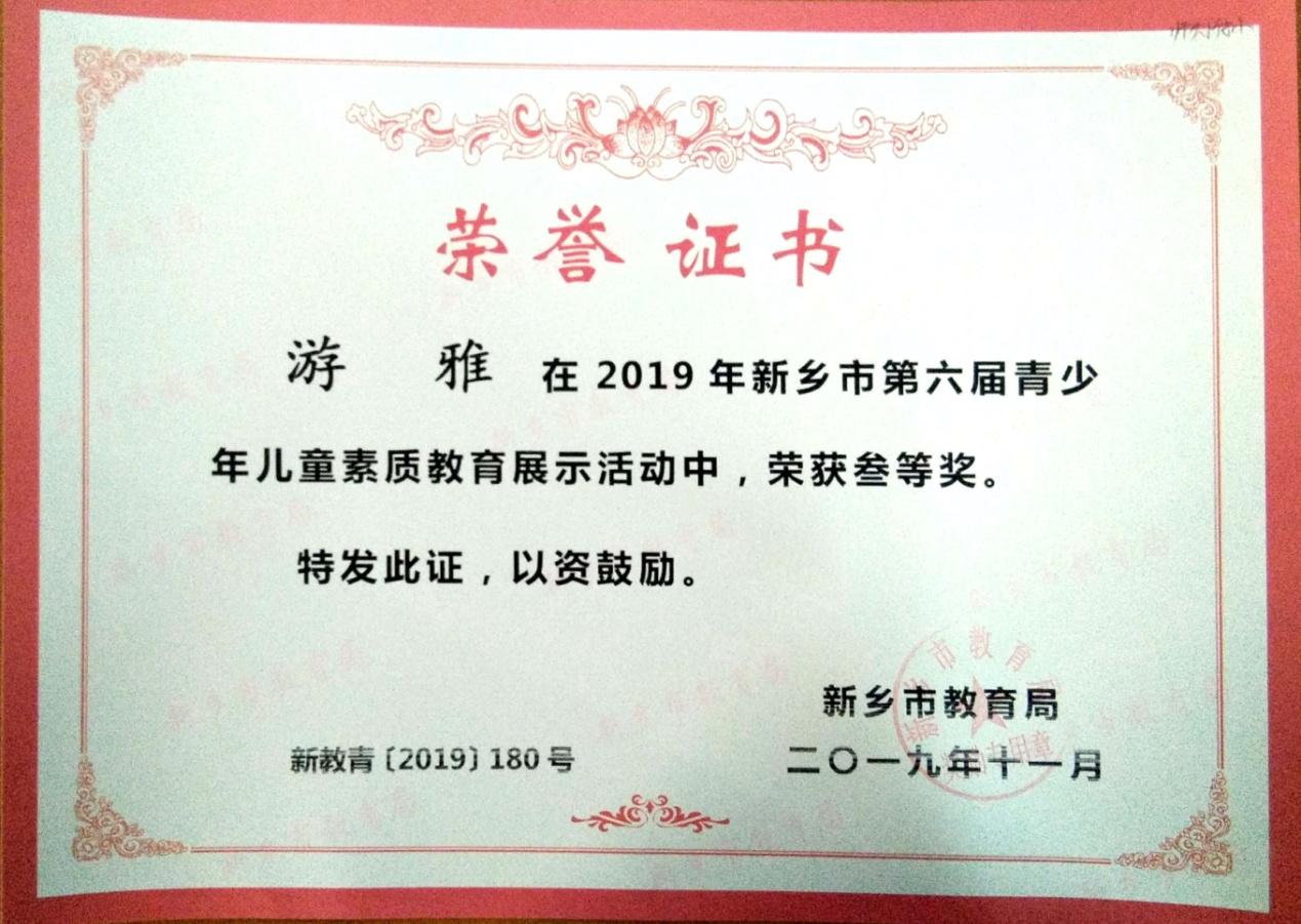 2019年11月,在新乡市教育局组织的“新乡市第六届青少年儿童素质教育展示活动”中,河南师范大学附属小学获优秀组织奖。(新教青〔2019〕180号)