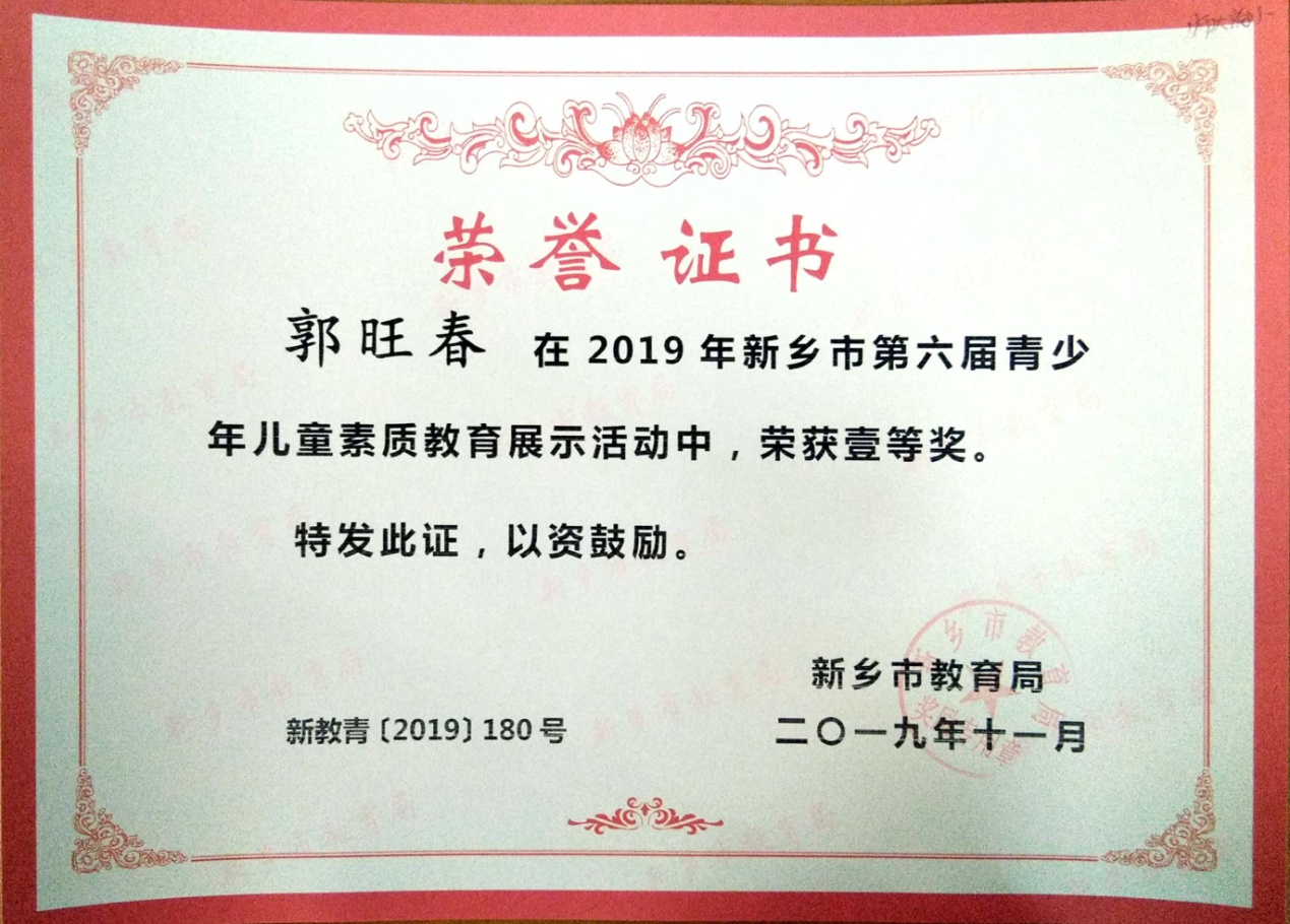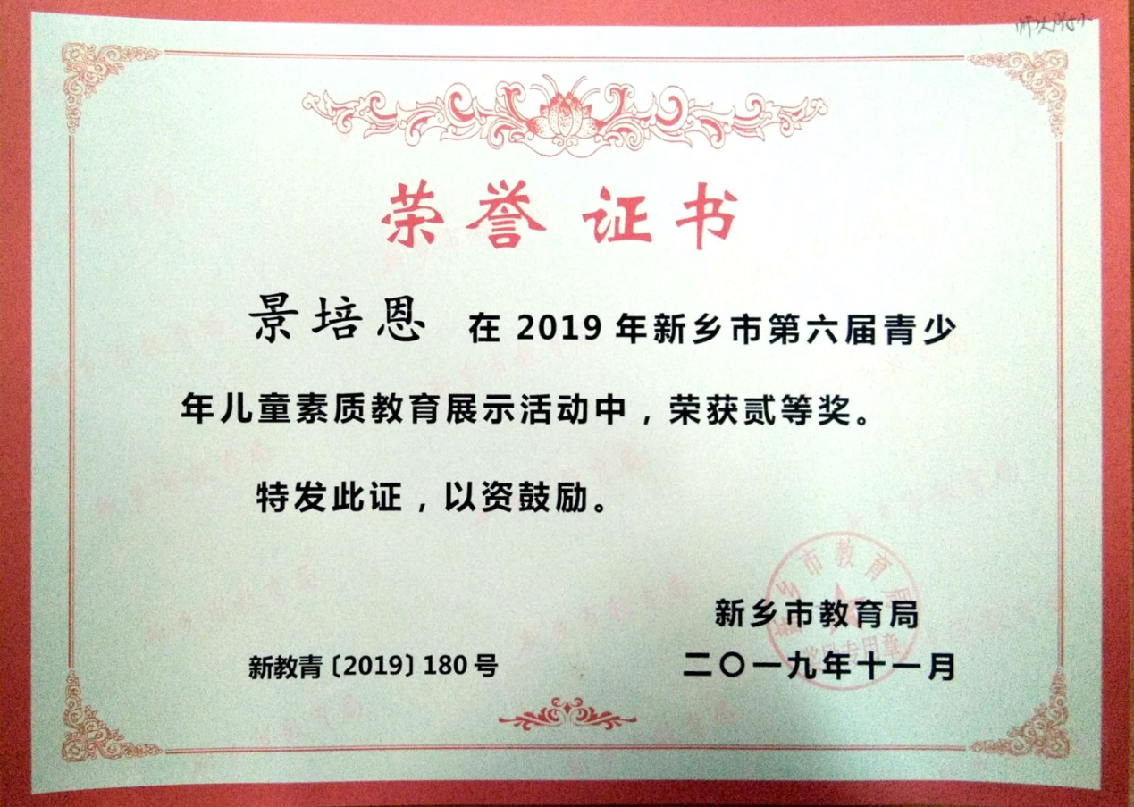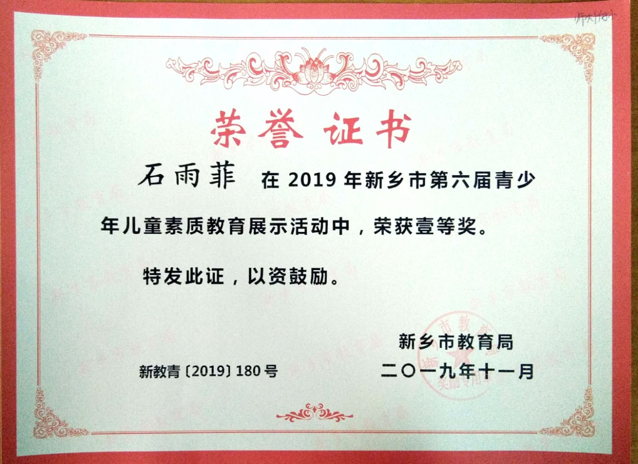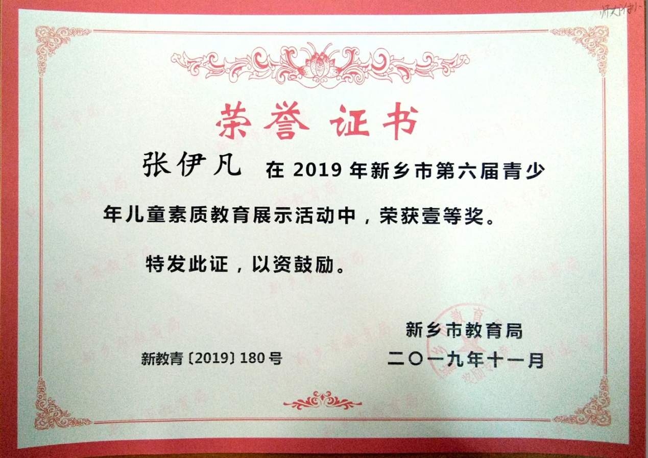 2019年11月,在新乡市教育局组织的“新乡市第六届青少年儿童素质教育展示活动”中,河南师范大学附属小学获优秀组织奖。(新教青〔2019〕180号)