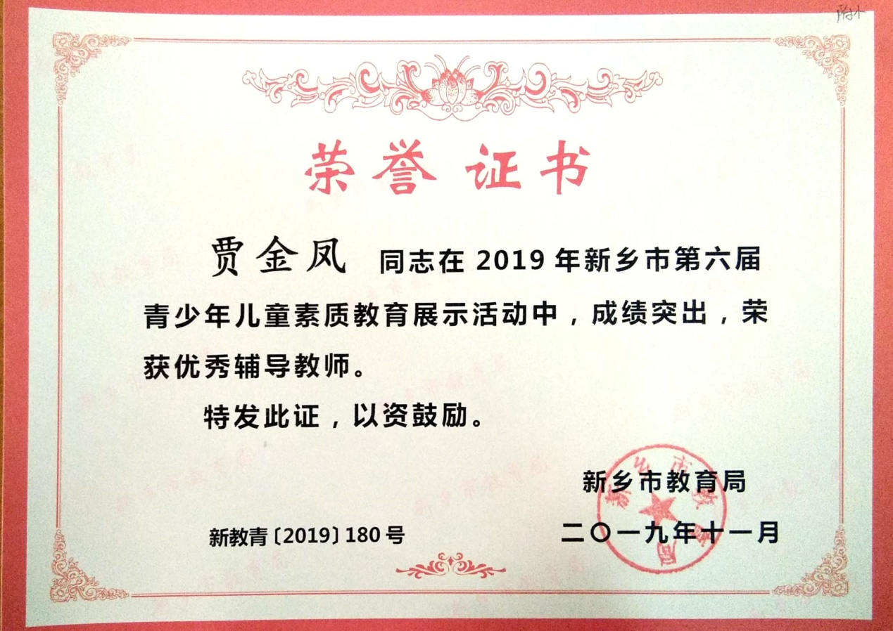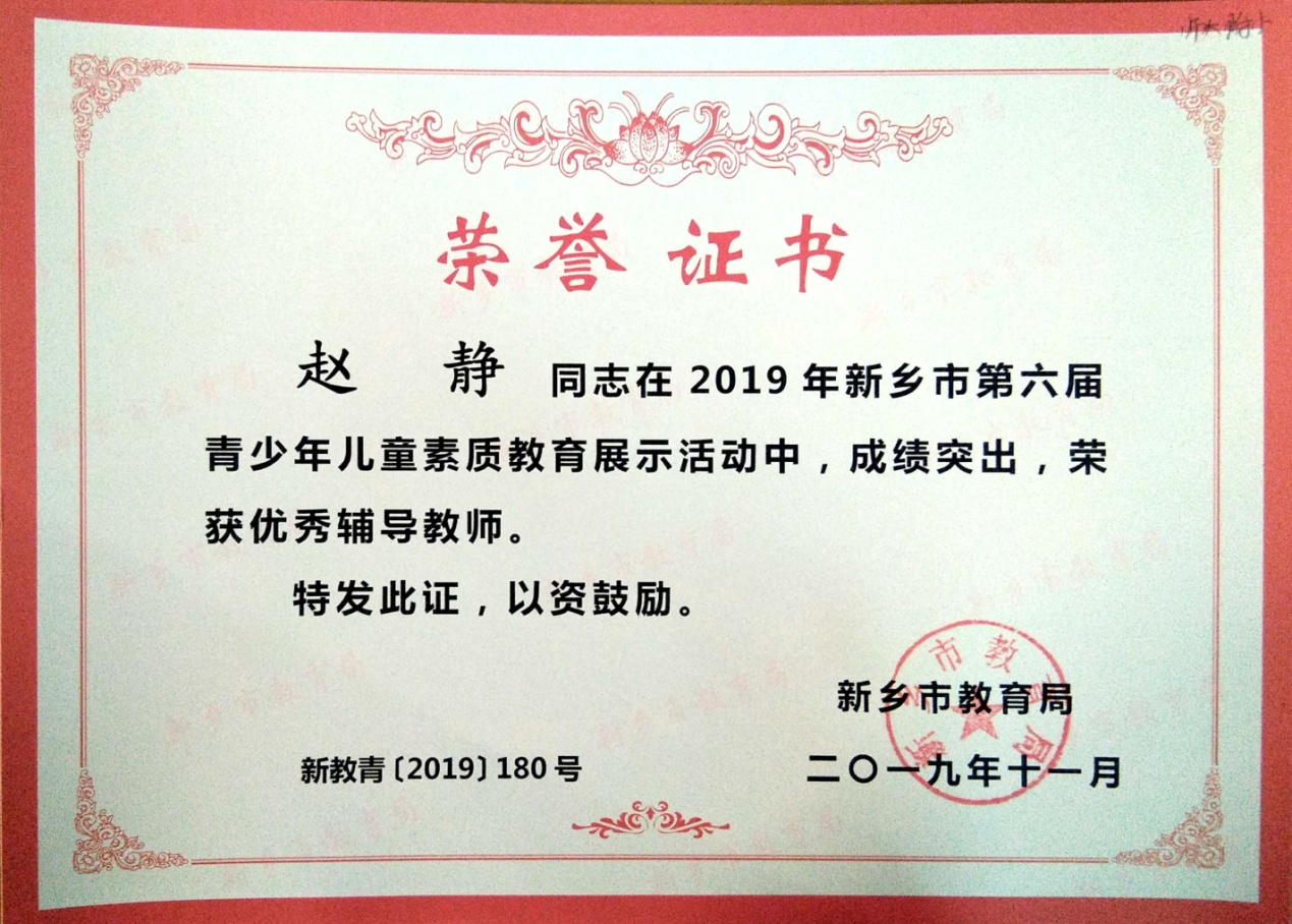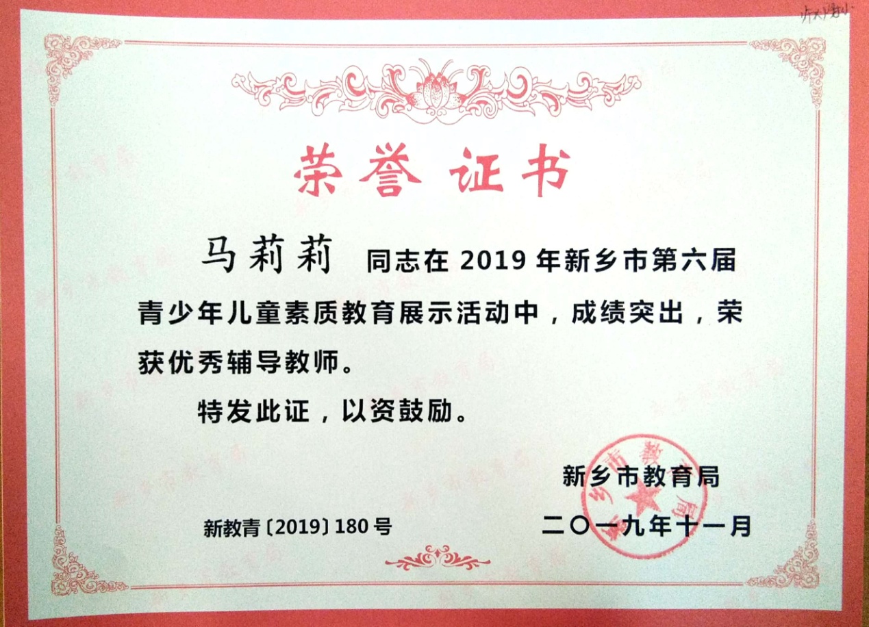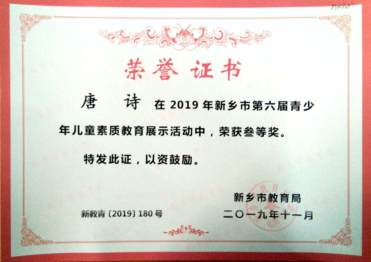 2019年11月,在新乡市教育局组织的“新乡市第六届青少年儿童素质教育展示活动”中,河南师范大学附属小学获优秀组织奖。(新教青〔2019〕180号)