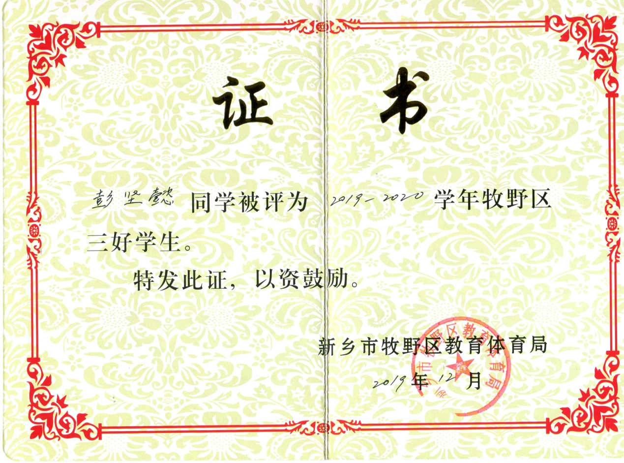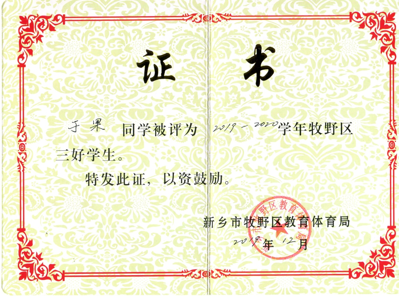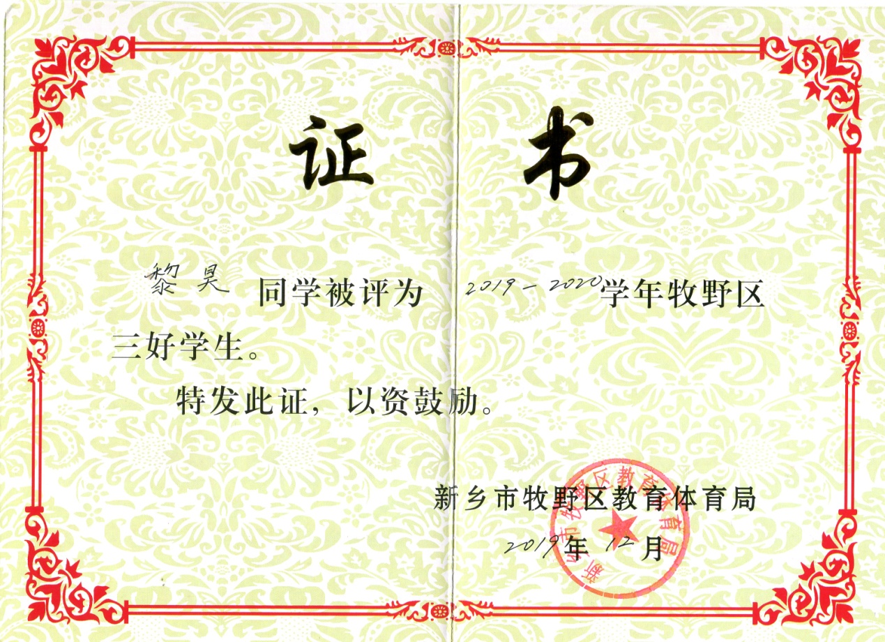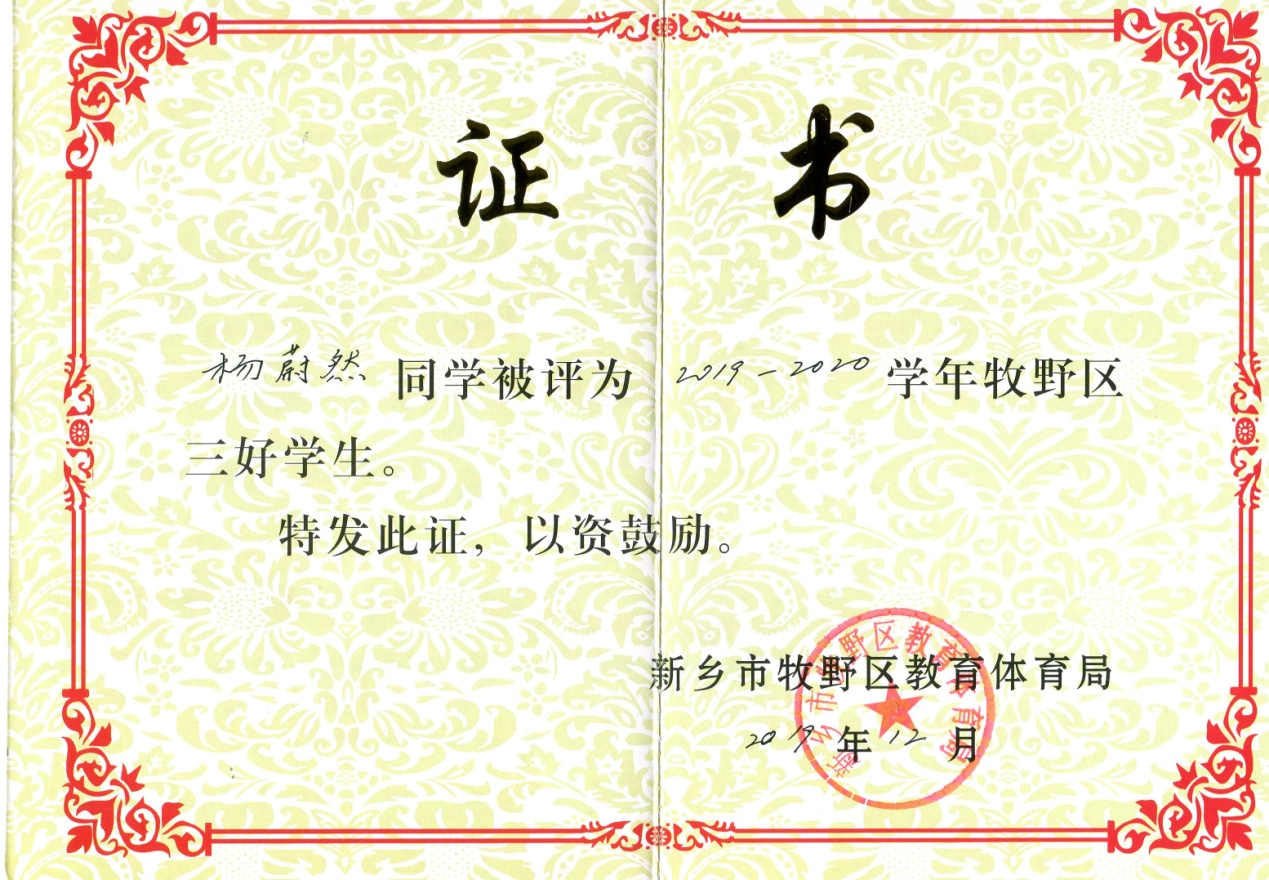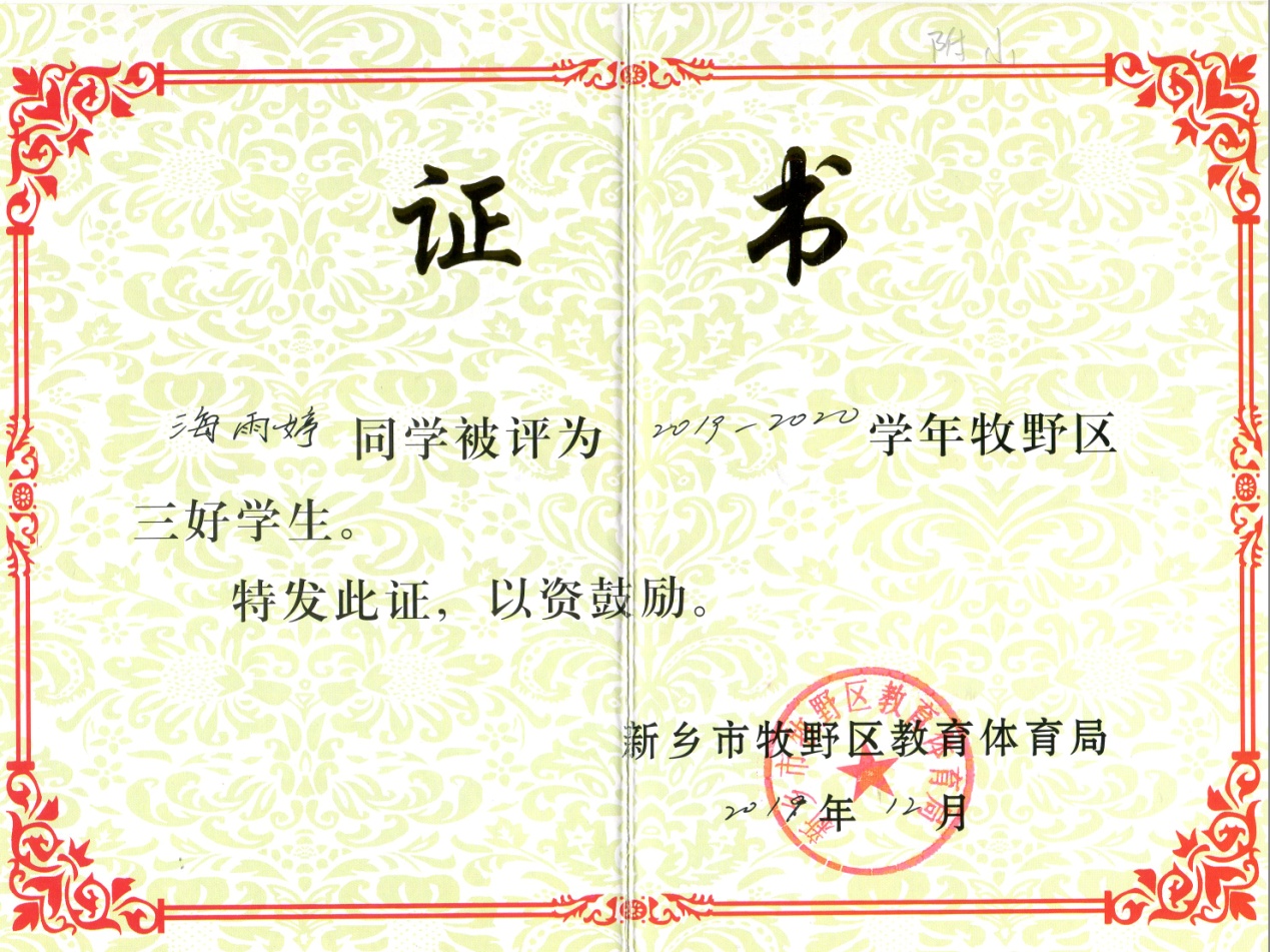 位同学在学校表现突出,被评为2019-2020学年牧野区三好学生。
