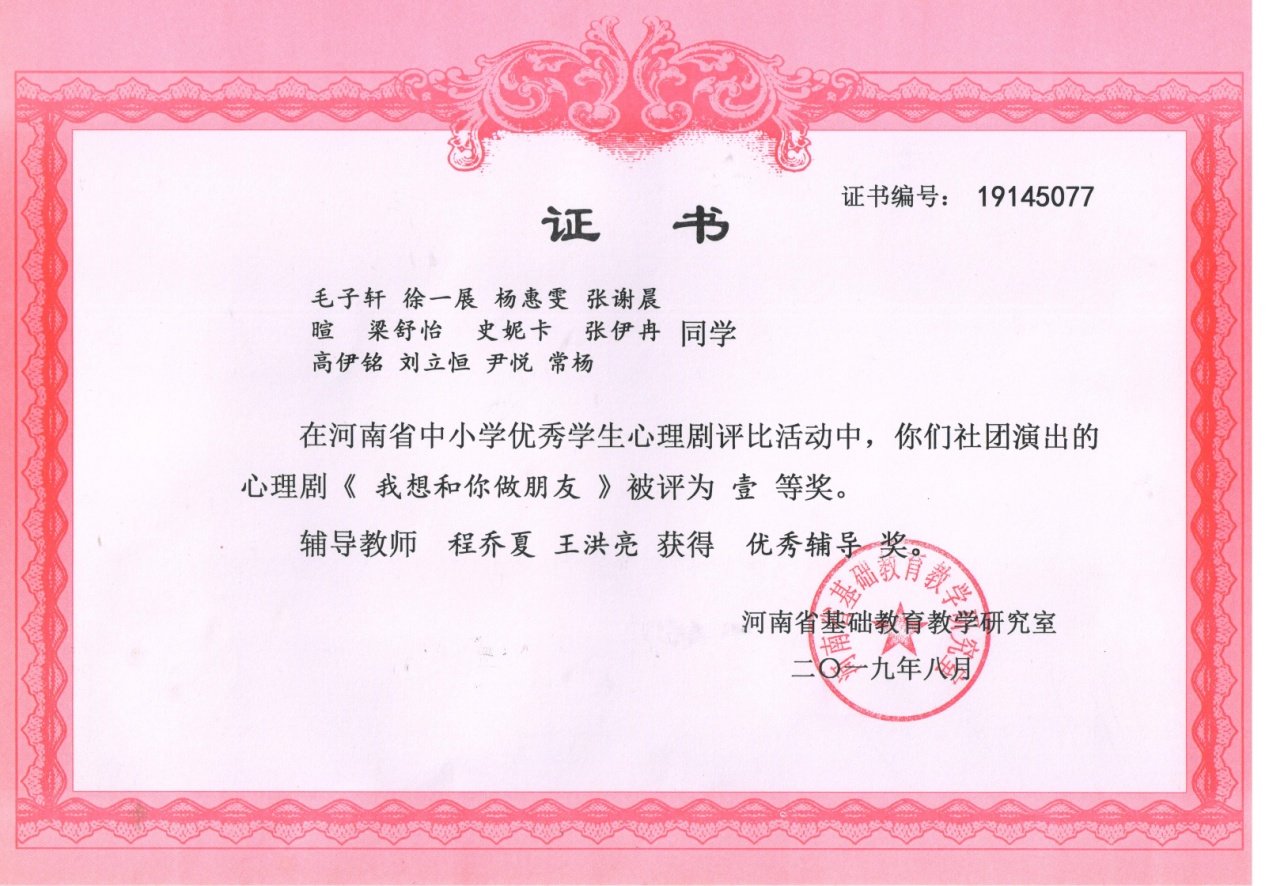2019年8月,程乔夏老师辅导的学生心理社团演出的心理剧《我想和你做朋友》,在河南省基础教研室举办的中小学优秀学生心理剧评比活动中被评为壹等奖。