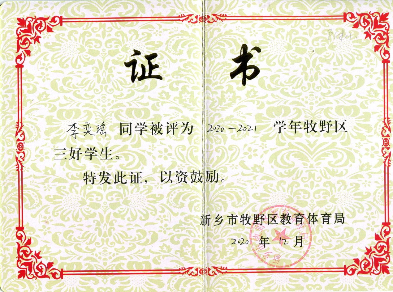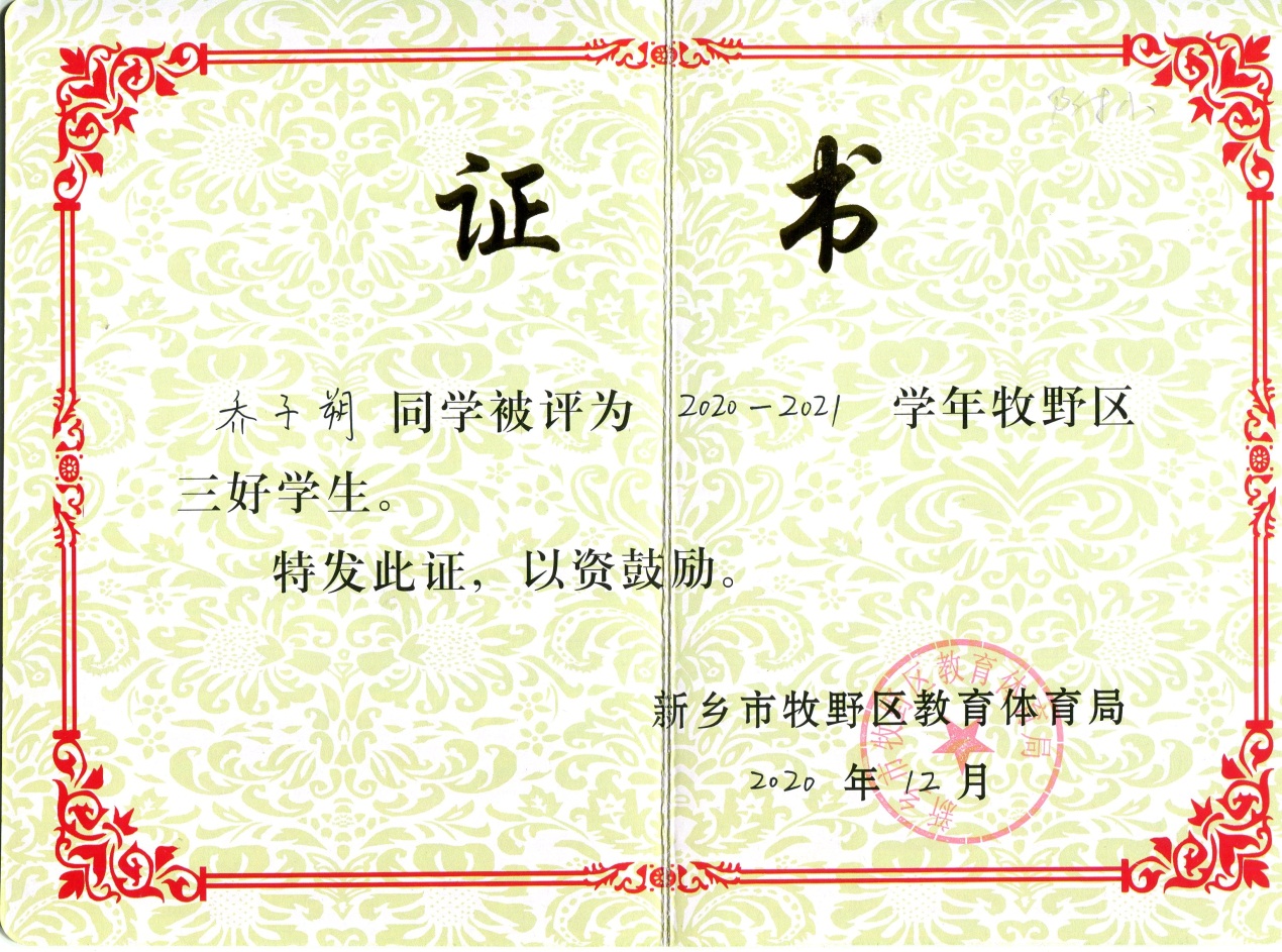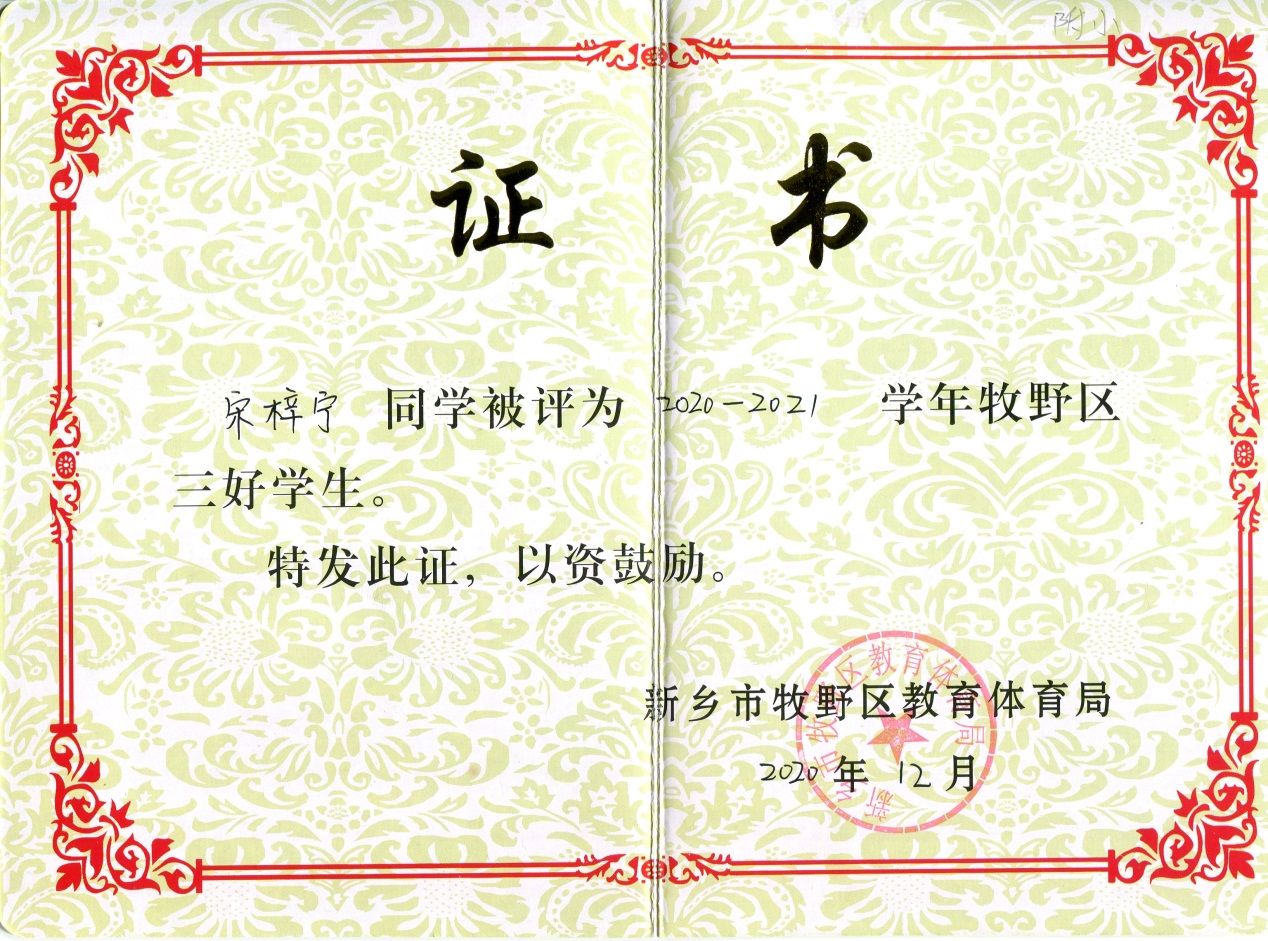 我校学生宋梓宁等6位同学被评为牧野区三好学生。