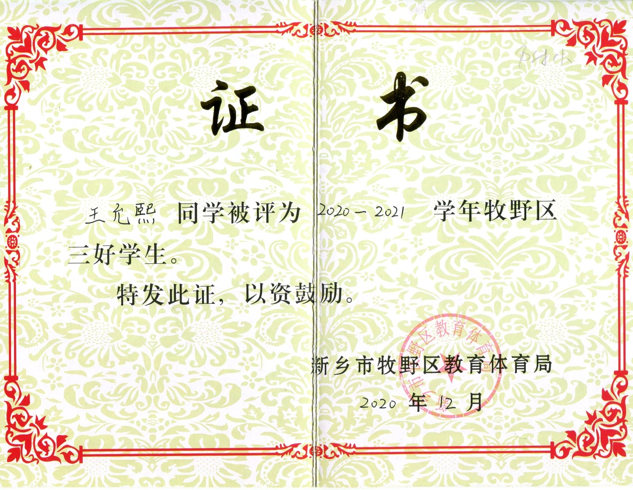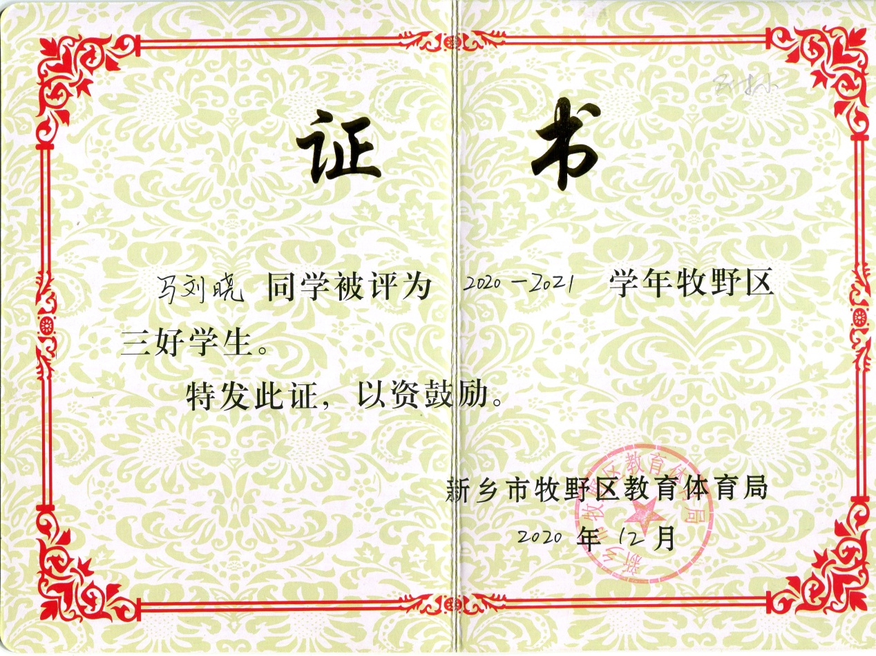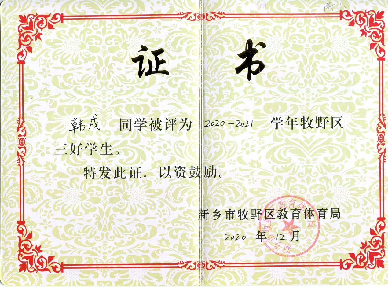 我校学生宋梓宁等6位同学被评为牧野区三好学生。