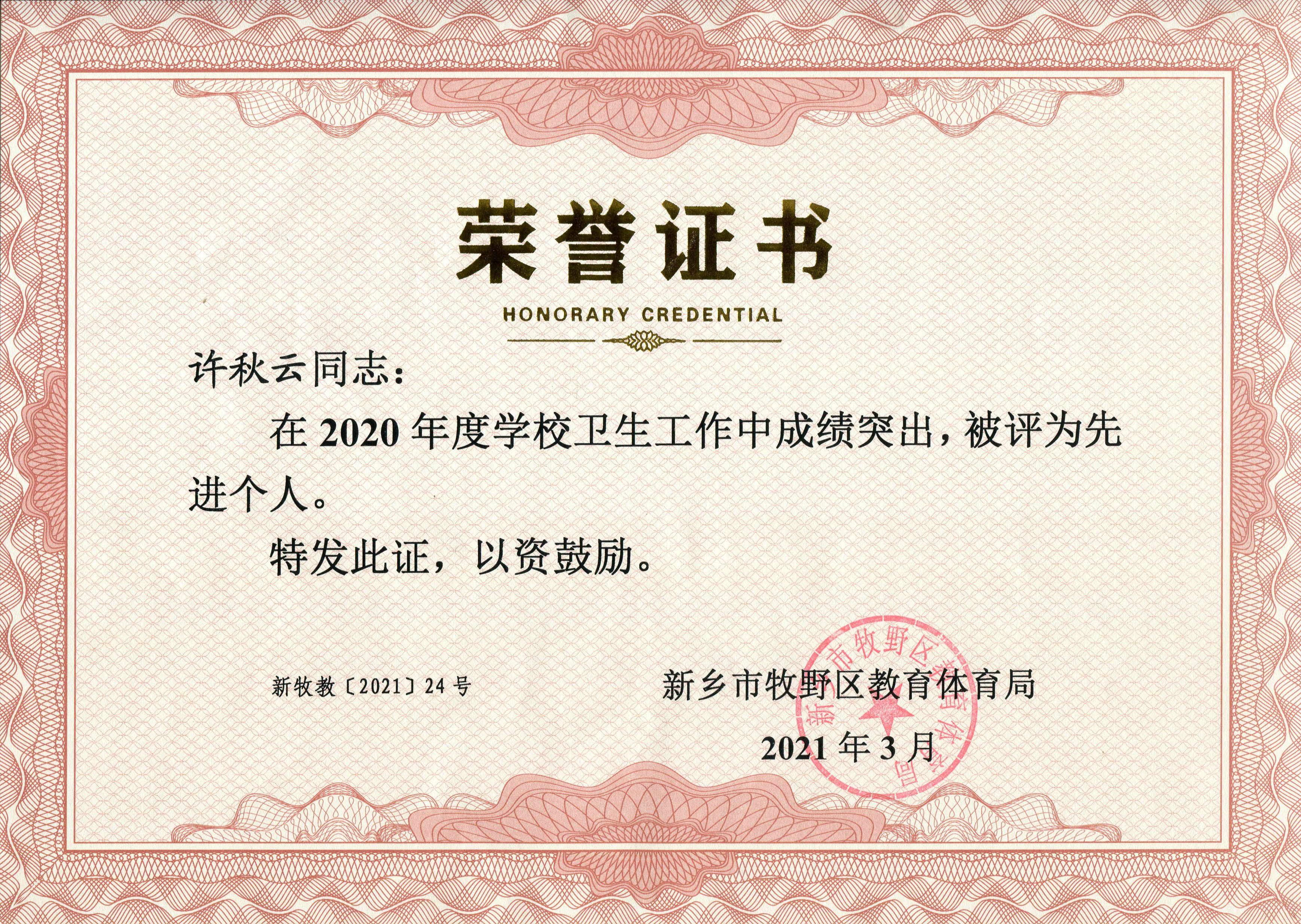 年度牧野区学校卫生工作中,我校许秋云和欧菲菲老师被评为先进个人。