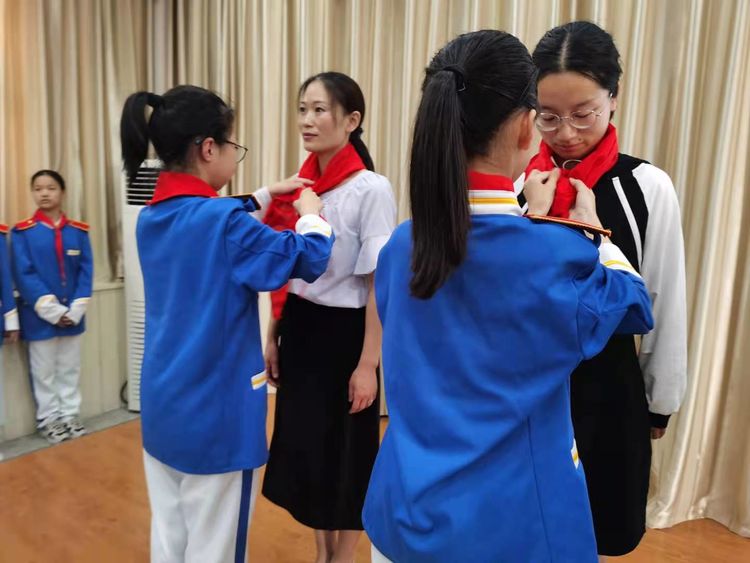 大队辅导员户老师庄严地宣布新入队队员名单,同时优秀学生代表为三位中队辅导员老师佩戴红领巾。