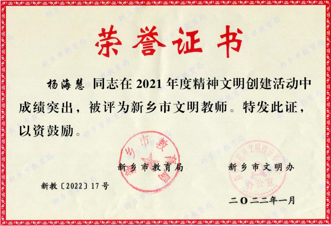 杨老师忠诚和热爱党和国家的教育事业,始终牢记“四个意识”,坚定“四个自信”,做到“两个维护”;热爱本职工作,有强烈的事业心和责任感,2021年1月在新乡市牧野区六年级教学质量评价中荣获全区第一名;始终坚持立德树人根本任务,严以律己,宽以待人,以德立身、以德立学、以德施教、以德育德;在全国文明校园创建、青年教师指导、疫情防控、抗洪救灾活动中表现突出。
