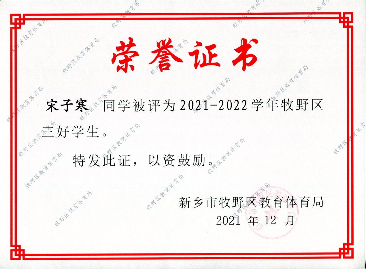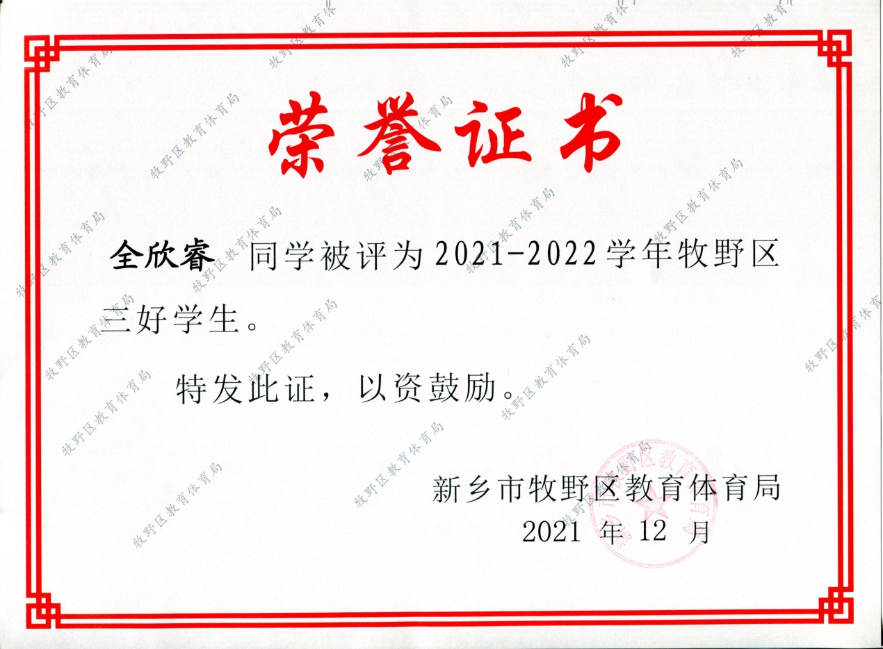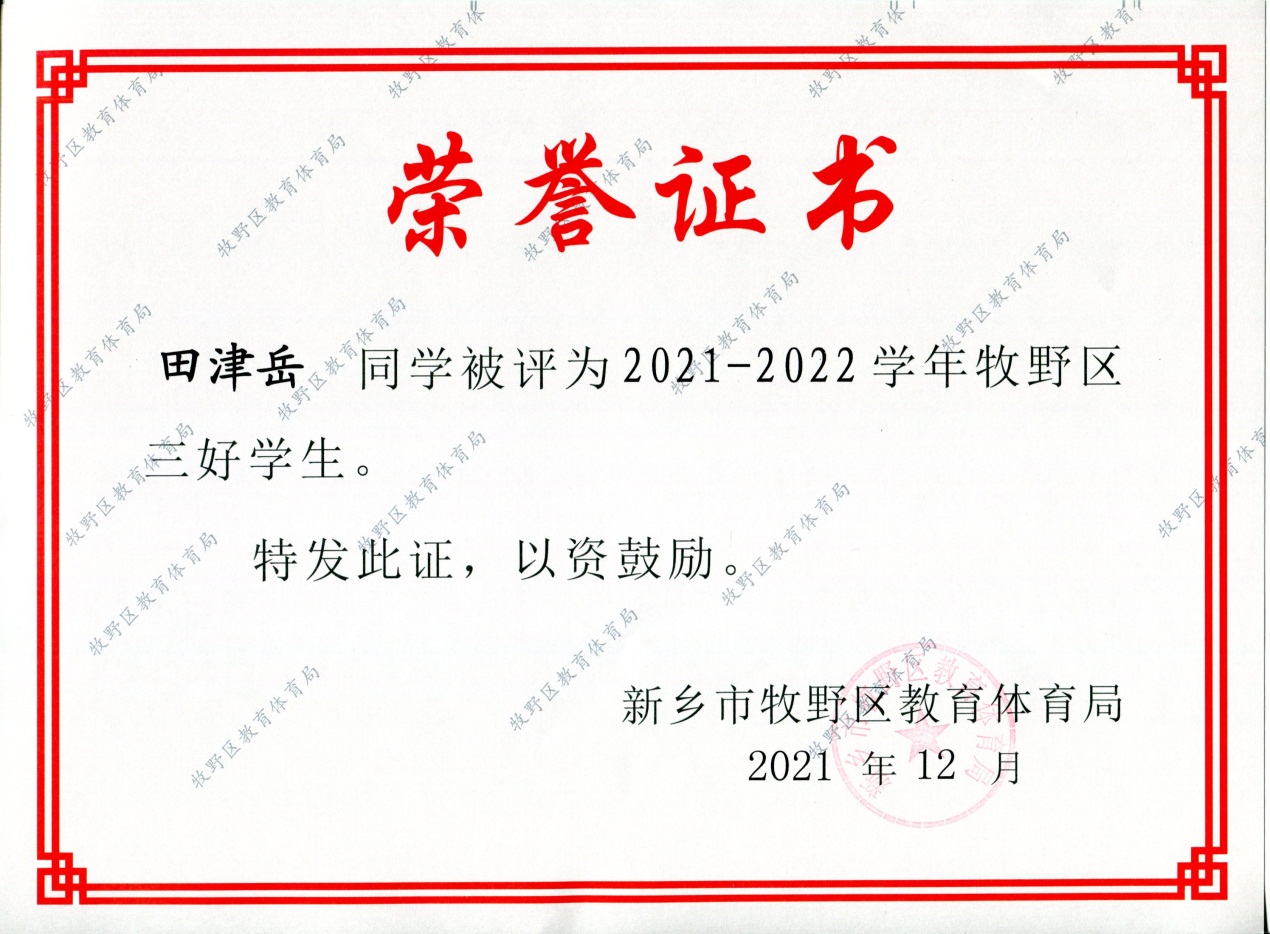 全欣睿、田津岳等六名同学被评为牧野区三好学生