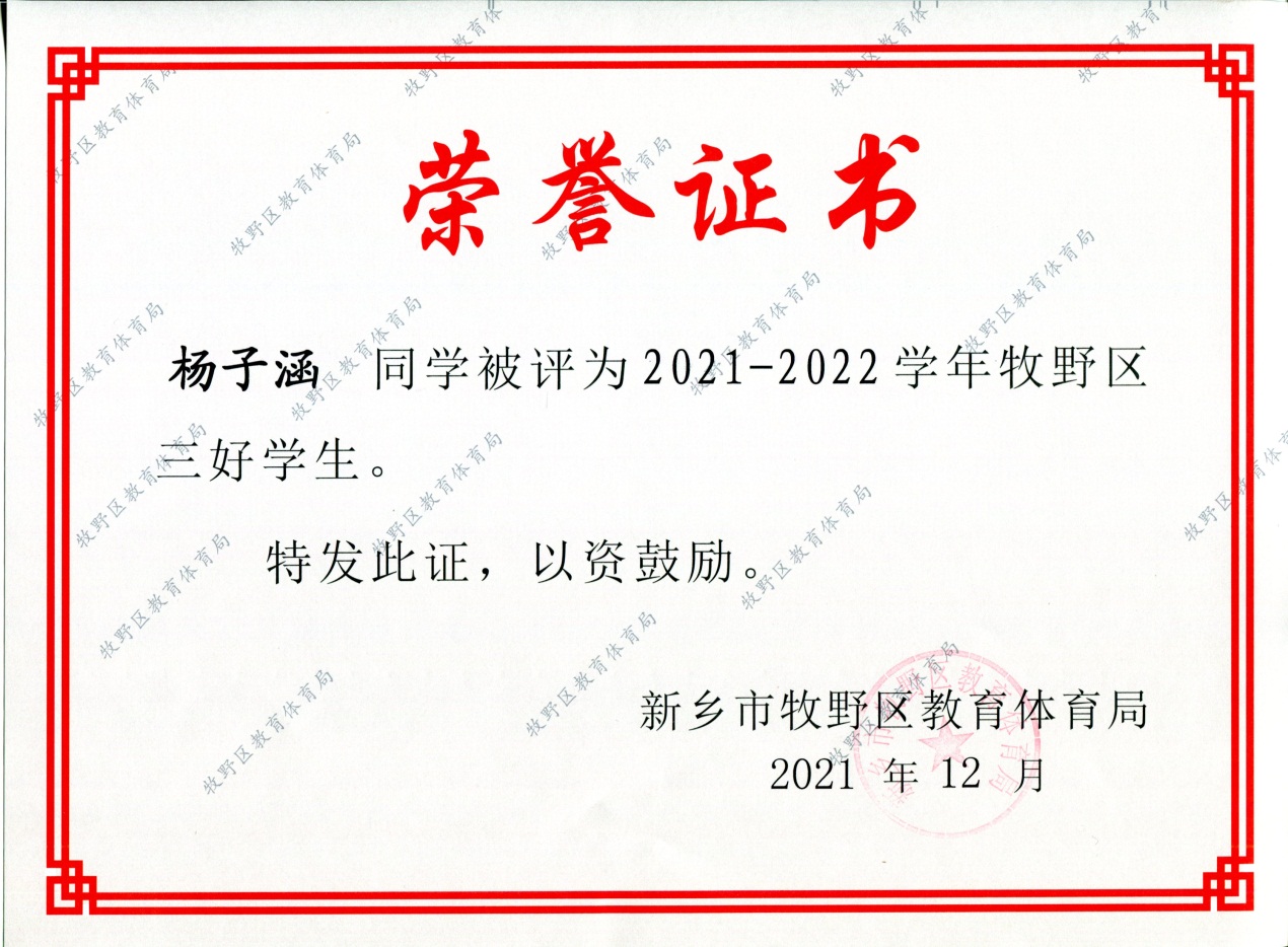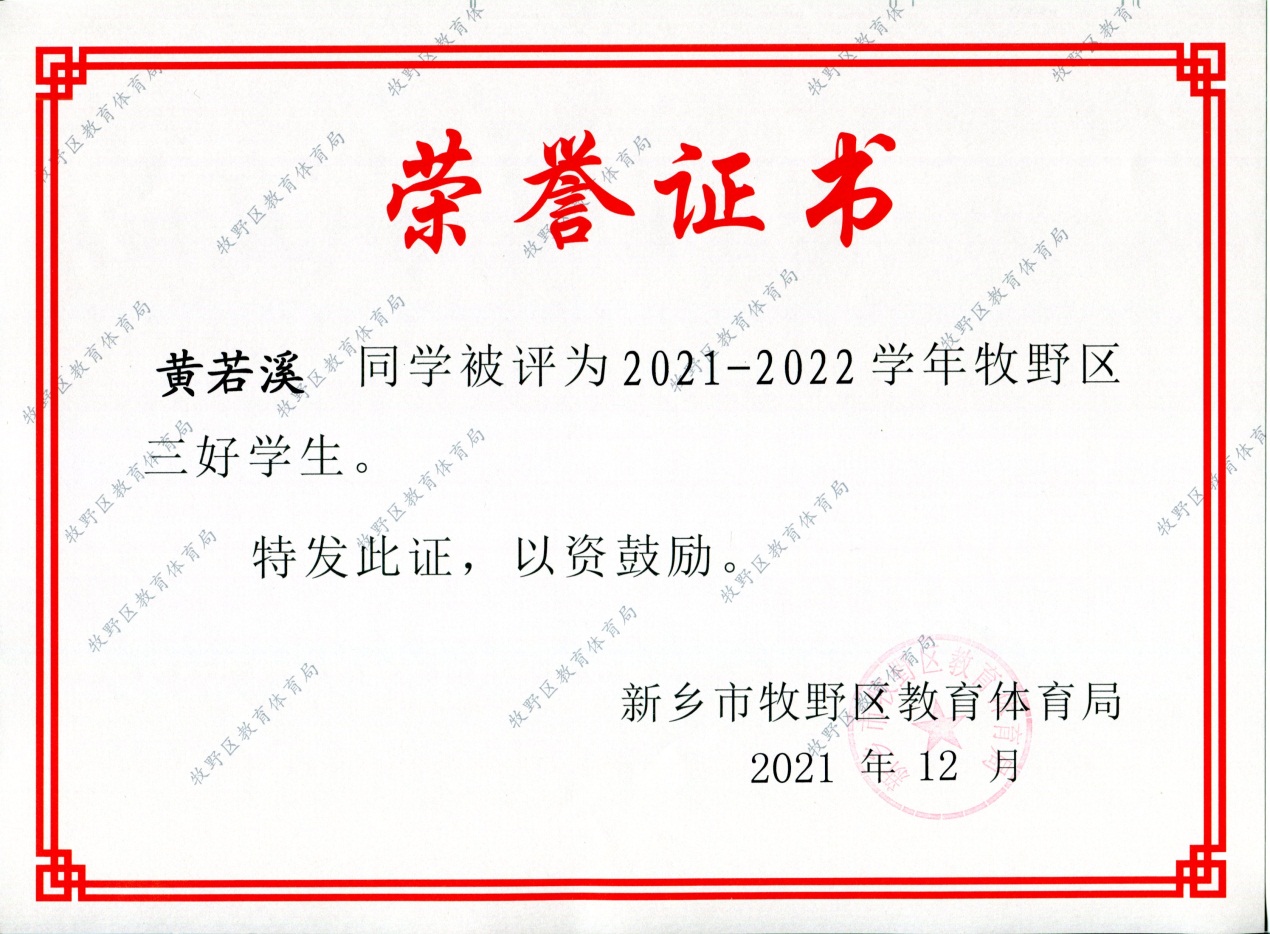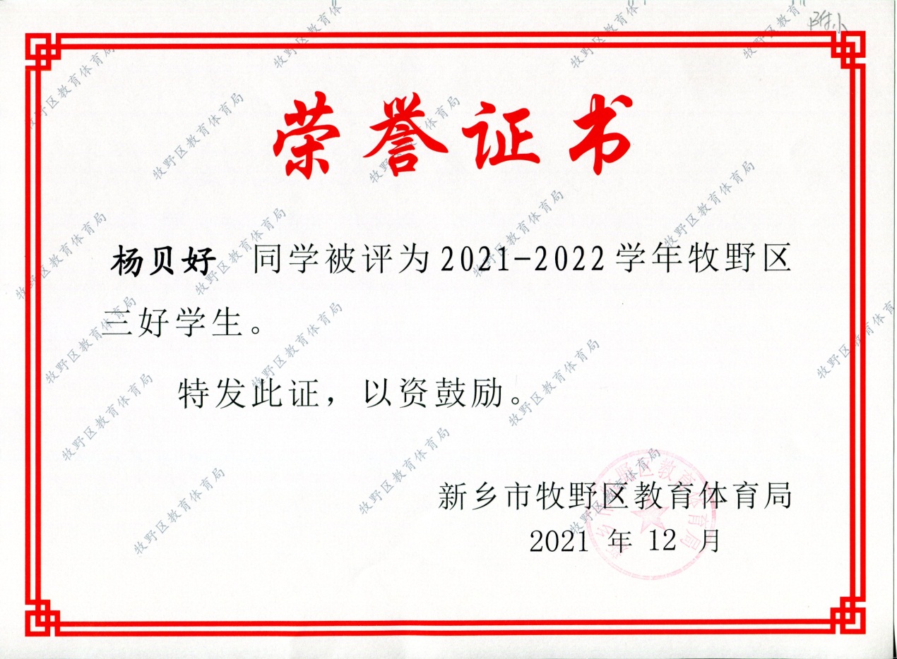 全欣睿、田津岳等六名同学被评为牧野区三好学生