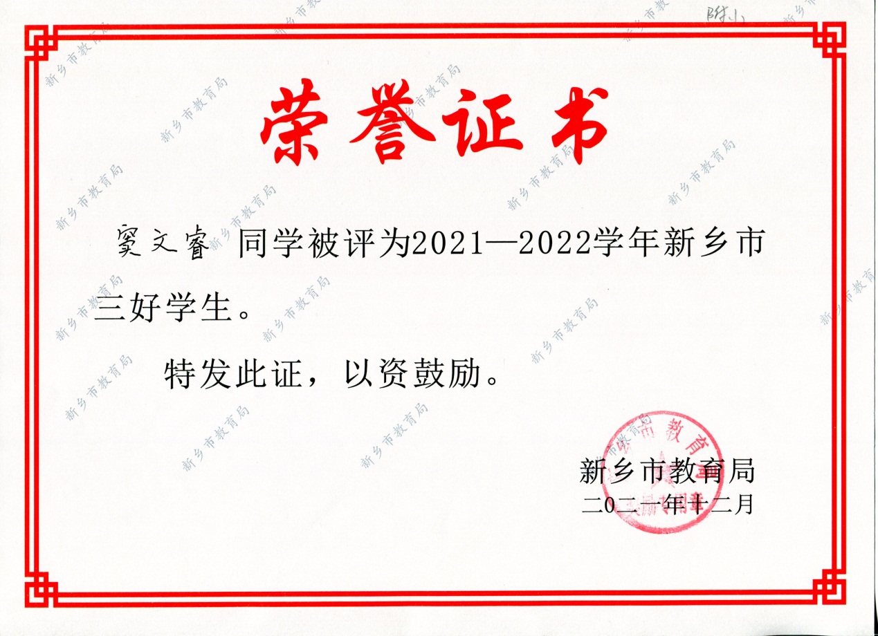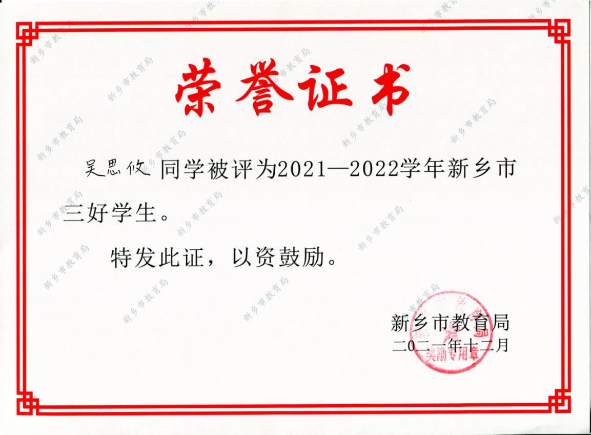 窦文睿、吴思攸被评为新乡市三好学生