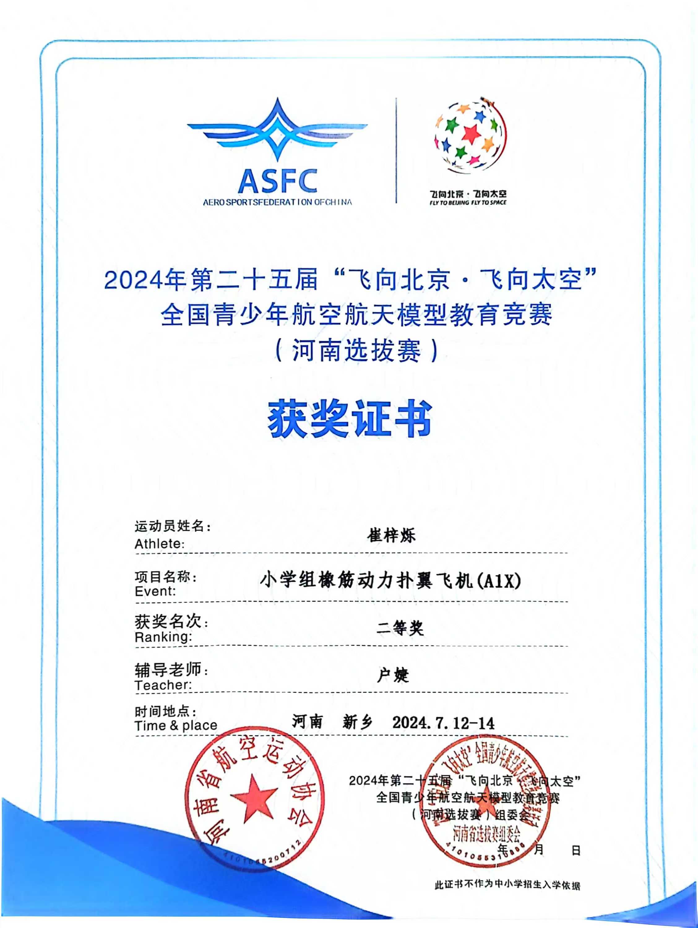 我校学生在2024年第二十五届“飞向北京·飞向太空”全国青少年航空航天模型教育竞赛中取得佳绩
