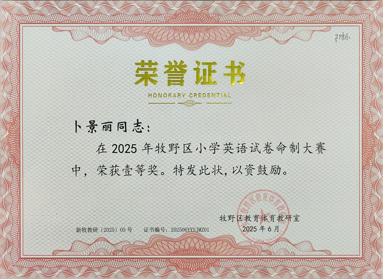 年牧野区小学英语试卷命制大赛中,我校卜景丽老师荣获一等奖