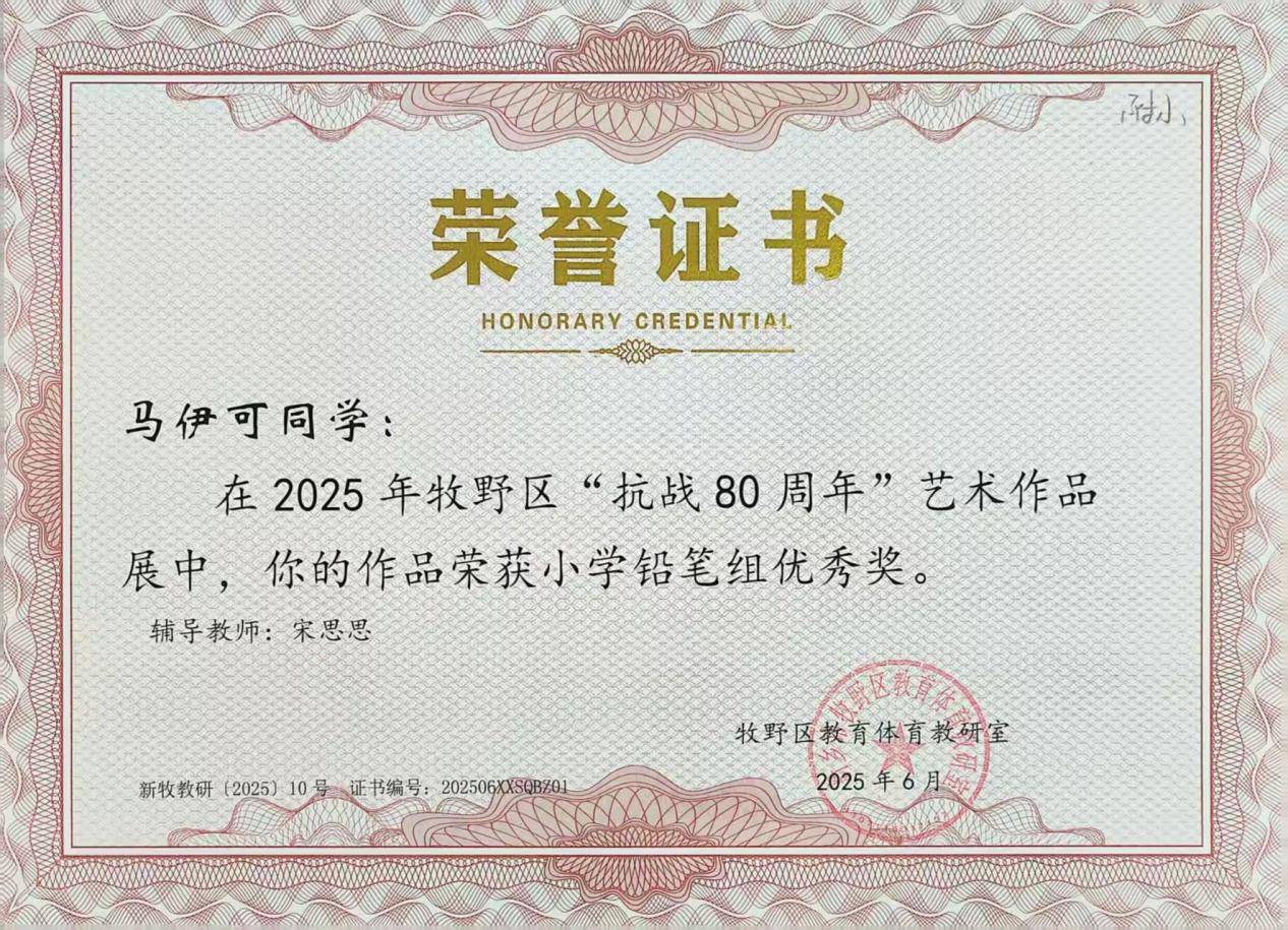 在2025年牧野区“抗战80周年”艺术作品展中,我校宋思思老师辅导的马伊可同学获小学铅笔组优秀奖,邹丽娜老师辅导的贺芯莹同学荣获小学毛笔组优秀奖。