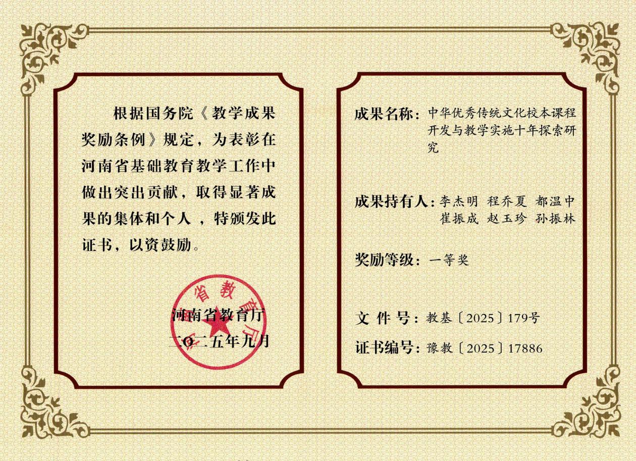 近日,河南省教育厅印发《关于公布2025年河南省基础教育教学成果奖评选结果的通知》(教基〔2025〕179号),附属小学两项教学成果从众多申报项目中脱颖而出,均获一等奖。其中,由该校教师李万里主持的《弘扬汉字文化二十三年研究与实践》,深耕汉字文化教育领域,历经二十三年探索形成特色教学模式;程乔夏参与的《中华优秀传统文化校本课程开发与教学实施十年探索研究》,聚焦校本课程建设,为传统文化进校园提供了可复制的实践经验。