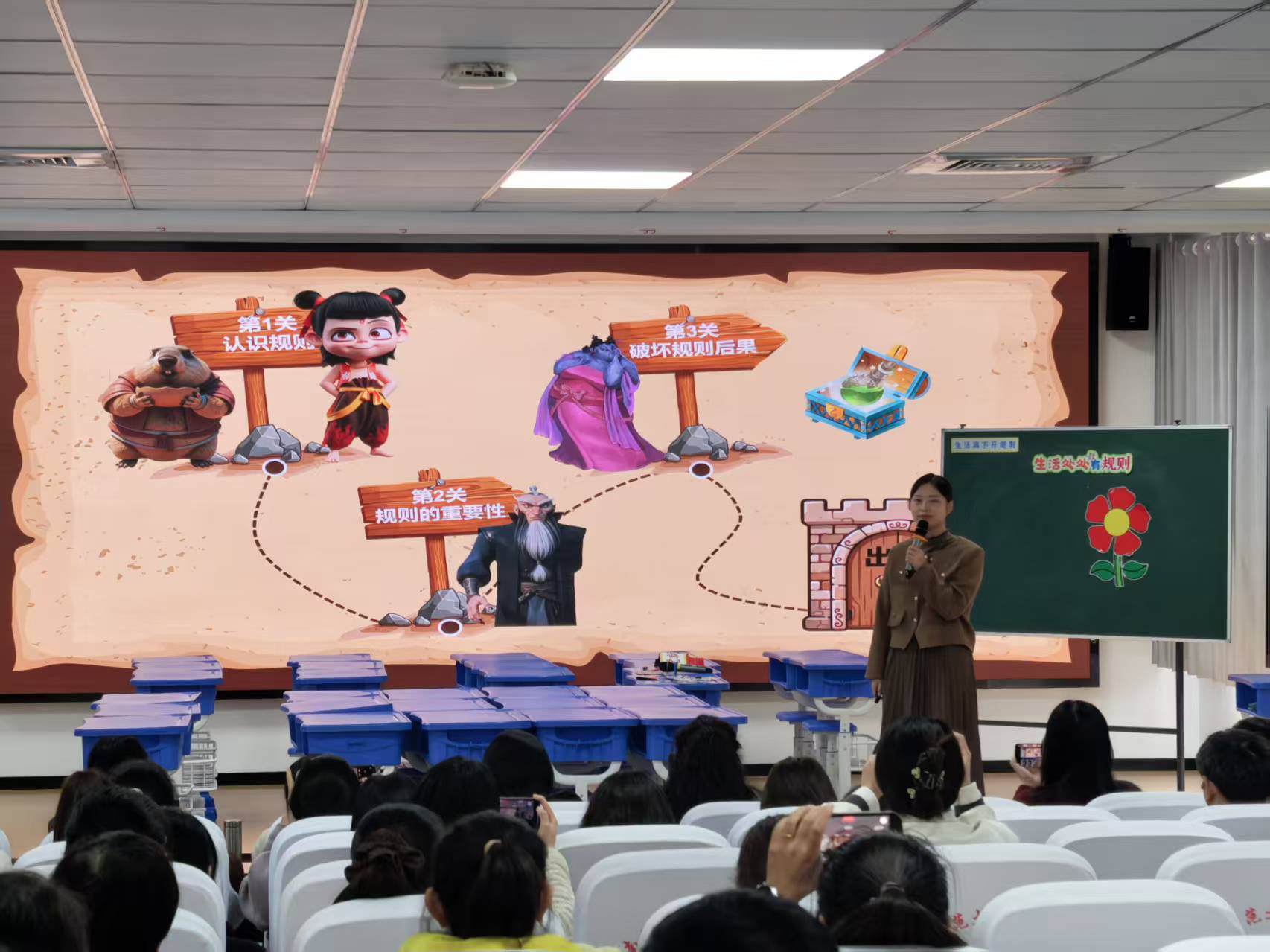 在随后的微型课展示环节,李静云老师执教三年级《道德与法治》中的《生活处处有规则》。她以“哪吒和敖丙”闯关为主线,创设生动情境,设计“闯三关”活动,让学生在趣味游戏中深刻理解规则的重要性,领悟“生活因规则而有序、因规则而美好”的道理。