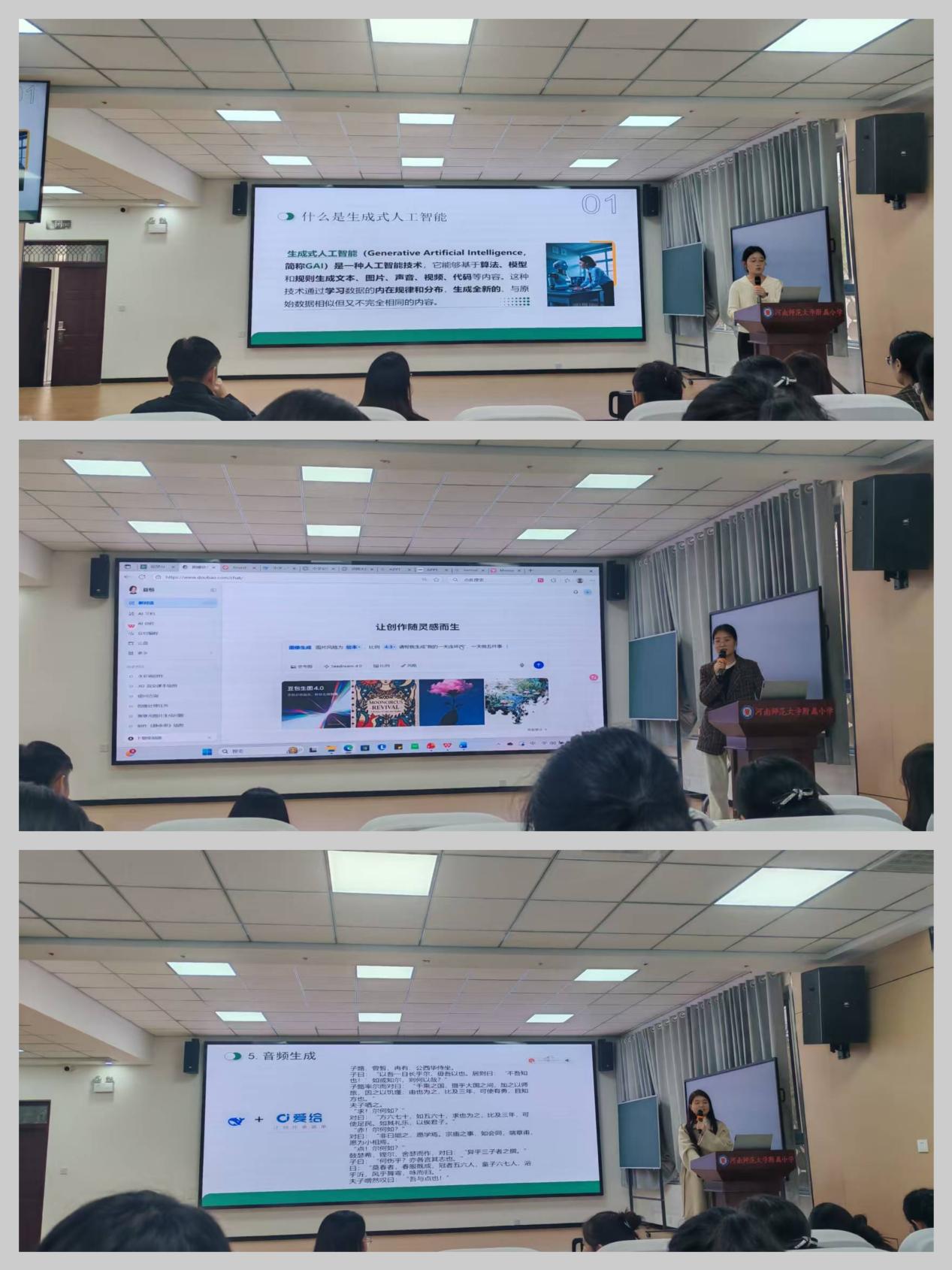 培训伊始,研究生团队以“AI在多场景教学中的应用”为主题,进行了生动有趣的实操演示。老师们现场观摩并学习了如何利用DeepSeek快速生成教学设计、如何通过豆包高效制作教学PPT、如何运用文生图与图生图工具设计教学素材、如何借助即梦平台将图文转化为动态视频,以及如何通过爱给网生成适配课堂的音频资源等。直观的演示、简洁的操作流程,让在场教师切实感受到AI工具为教学备课带来的高效与便捷。