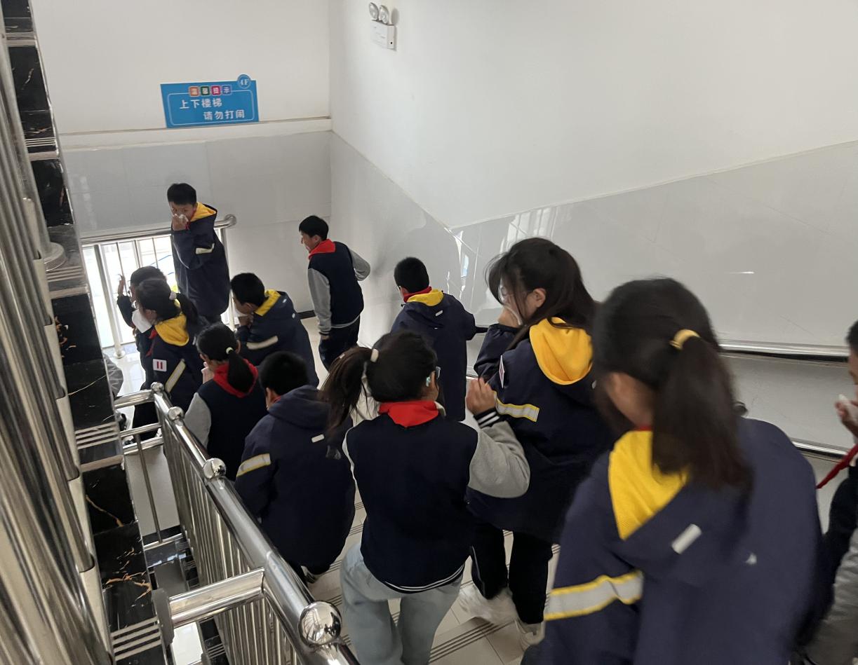 下午第二节课后,随着总指挥李万里校长一声令下,演练正式开始。校园广播同步响起火灾警报与疏散指令:“现在发生火灾,全体师生立即疏散。”警报声循环鸣响。各班学生迅速反应,在班主任和任课教师的组织下,用湿毛巾捂住口鼻,弯腰低姿,按预定路线分两队沿墙快速撤离。各楼层、楼梯口的疏导教师坚守岗位,不断提示学生“保持冷静、不要拥挤、注意脚下”,有序指挥,确保通道畅通、过程安全。