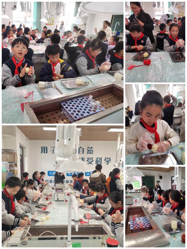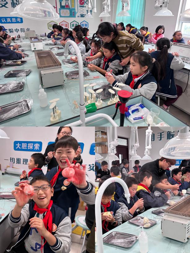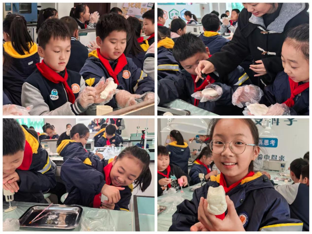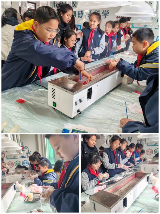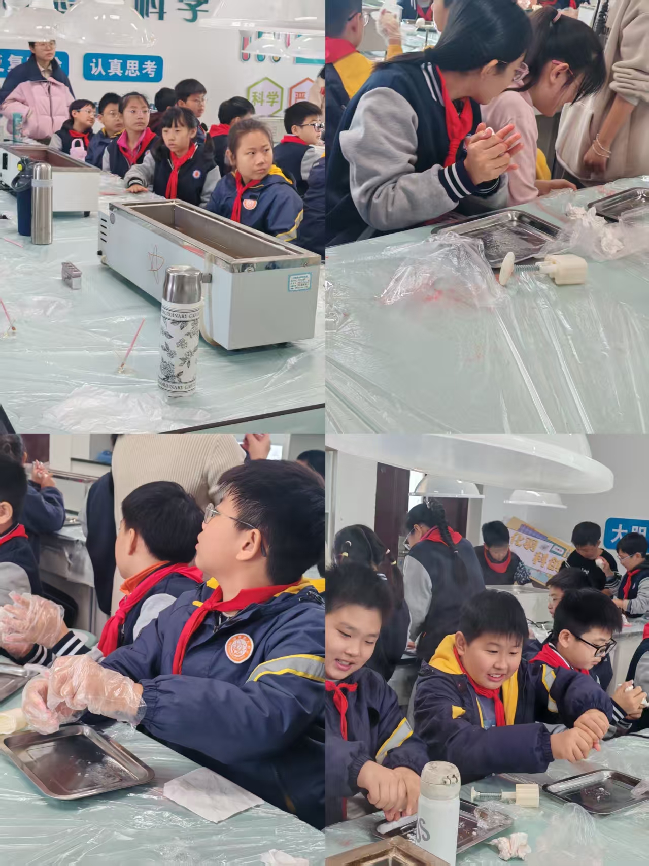 活动当天,河师大附小的化学实验室里热闹非凡。在化工院志愿者与劳技课教师的共同指导下,同学们分组有序操作。从分配基础原料,再到根据喜好加入天然精油,每一步都充满好奇与专注。原料充分融合后,大家小心翼翼地将皂基倒入星星、小熊、爱心等造型各异的模具中,挤压成型。