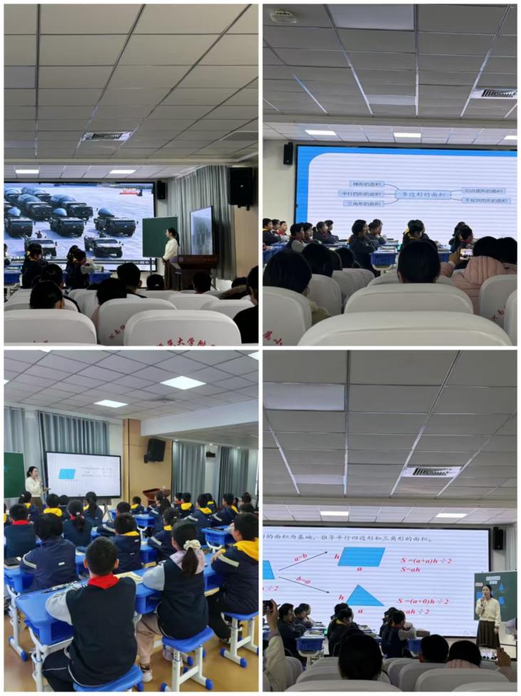 王炳炳老师以纪念抗战胜利阅兵中,东风 5C导弹模型创设情境,将爱国主义教育自然融入数学课堂。课堂上,她借助几何画板动态演示图形转化过程,引导学生发现梯形面积公式可统整所有多边形面积计算,让 “转化思想” 可视化、可感知;结尾处,通过 计算台湾岛面积的实际问题,将知识应用与国情教育结合,实现“数学思维 + 价值引领”的双重突破,让复习课焕发新活力。