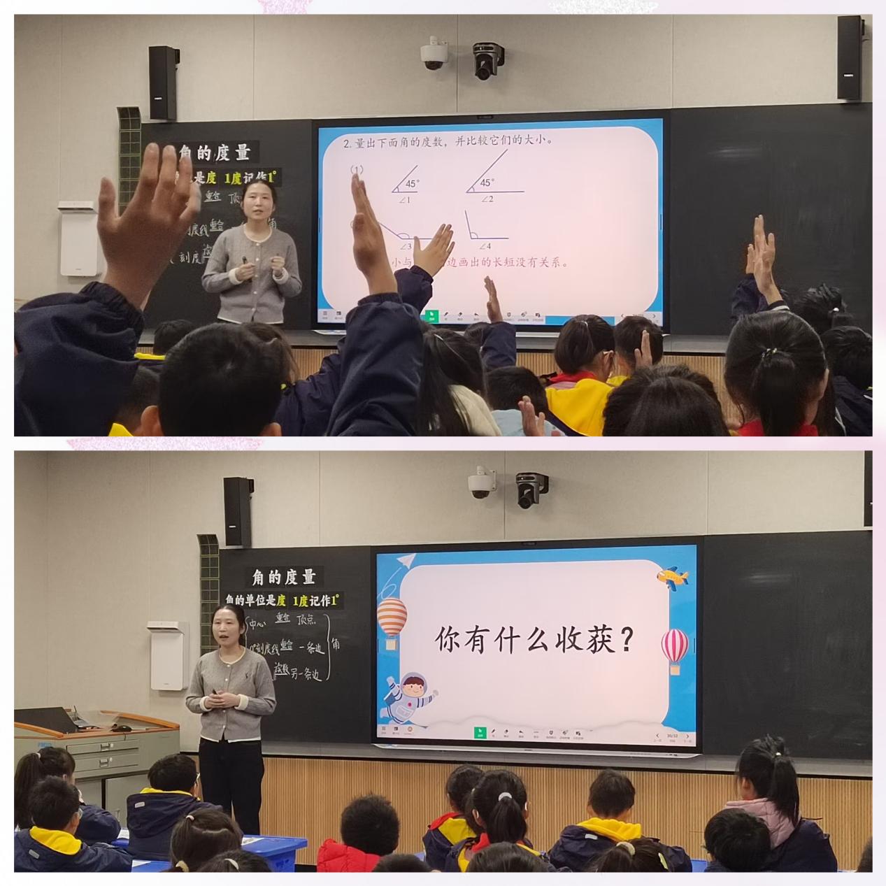 第三节课,王炳炳老师与四(1)班的同学一起攻克了《角的度量》这一难点。王老师注重学生的动手实践和自主探究,将复杂的知识化解于无形,也培养了数学实操能力。