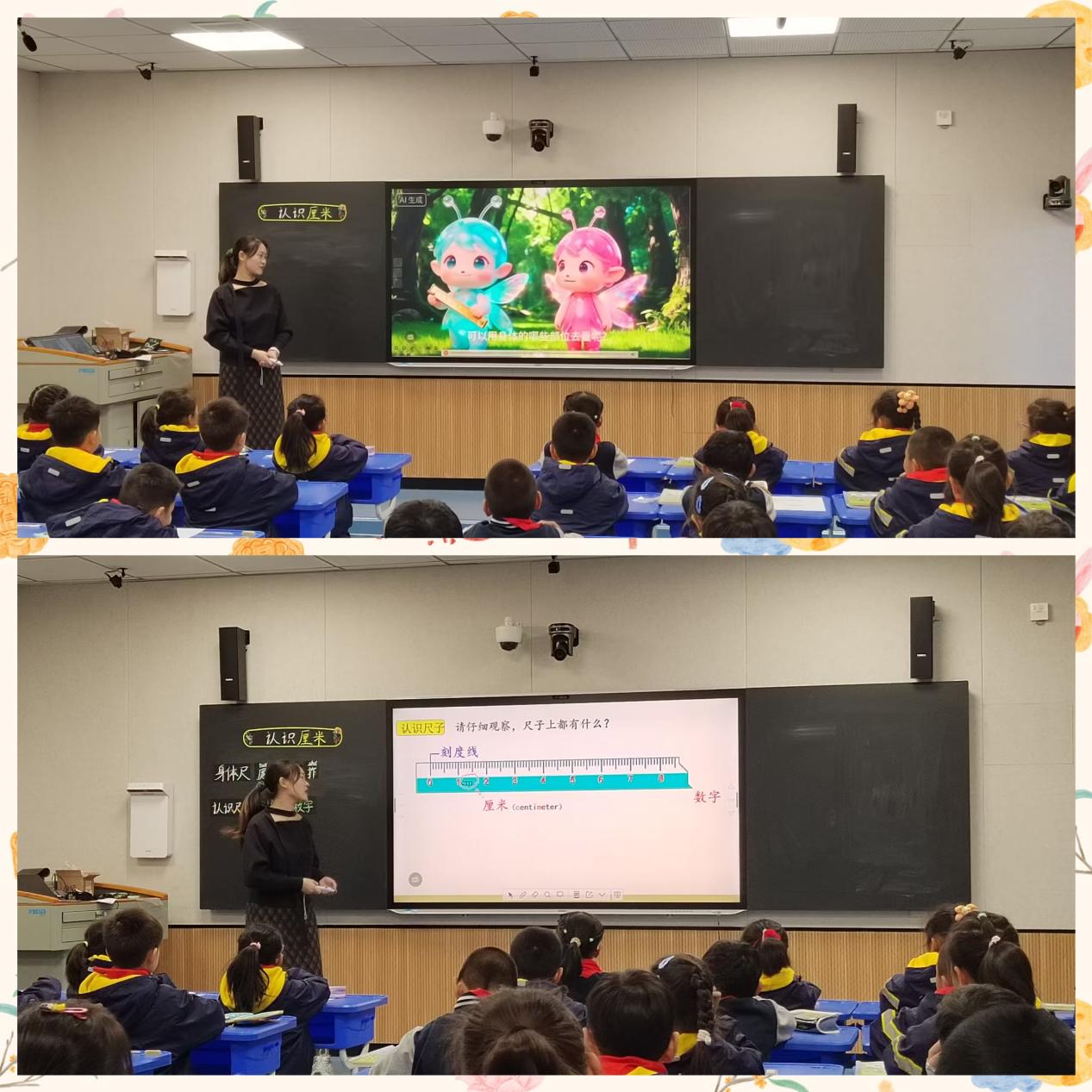 第二节课,侯诗若老师带领二(5)班的同学《认识厘米》,从生活实际出发,通过观察、操作,将抽象的数学概念变得触手可及,孩子们学得不亦乐乎。