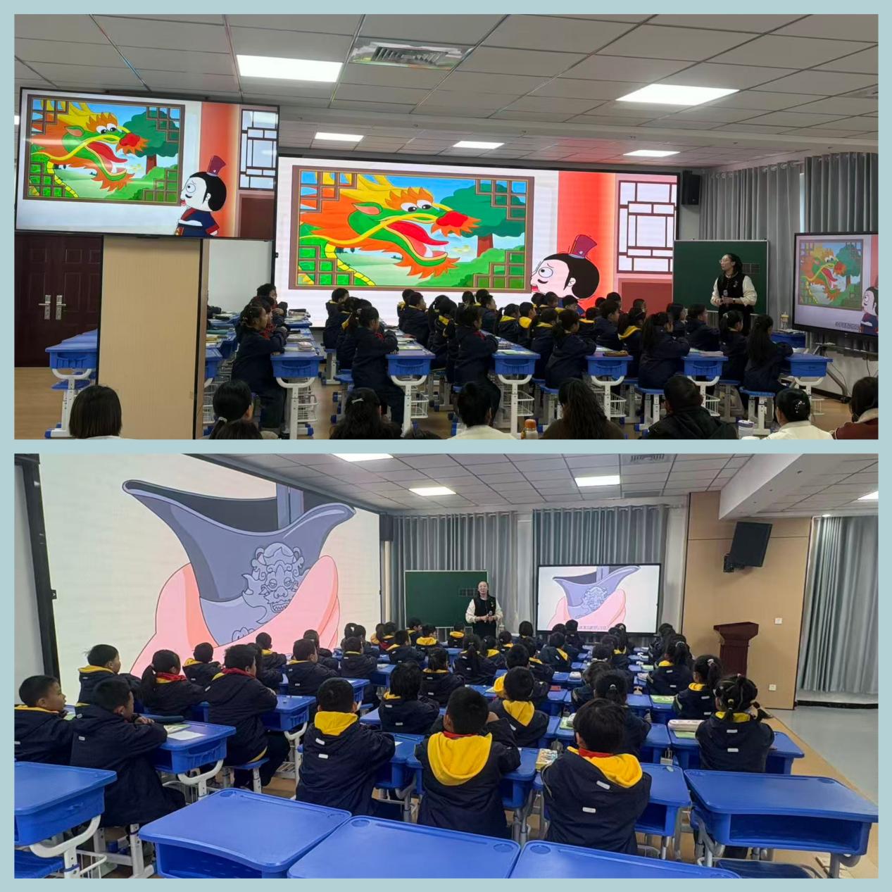 第一节课,赵妍老师与二(2)班的孩子们带来了校本课程《叶公好龙的“龙”》。赵老师巧妙地将传统文化与儿童兴趣相结合,引领孩子们在古老的寓言中探寻“龙”的文化密码,课堂充满童趣与想象,最后孩子们齐声高唱的《天地龙鳞》,更让大家振奋不已。