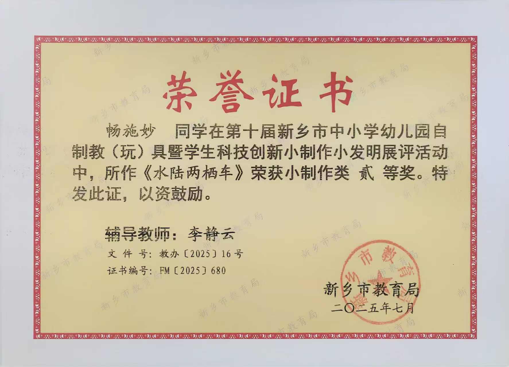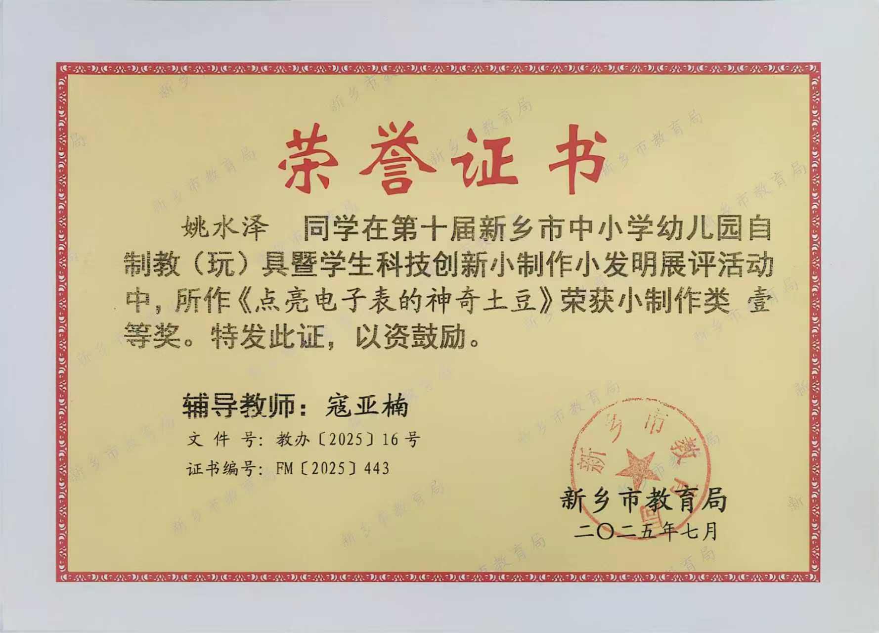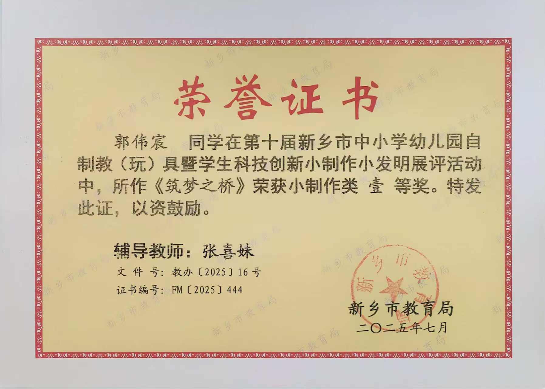 在第十届新乡市中小学幼儿园自制教(玩)具暨学生科技创新小制作小发明展评活动中,我校学生郭伟宸、姚水泽同学荣获小制作类一等奖,畅施妙荣获二等奖;张喜妹、寇亚楠、李静云荣获辅导教师奖。