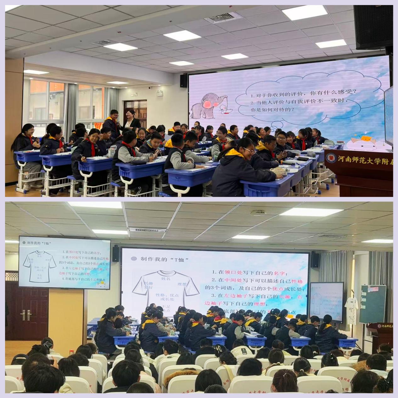 李静静老师与六(3)班的同学们共同呈现了一堂深刻而温暖的心理课《正确认识自己》。李老师从“生理自我、心理自我、社会自我”三个维度,引导孩子们进行多角度的自我探索与评价。课堂上,孩子们动手绘制了属于自己的“个性T恤衫”,用文字勾勒出独特的自我画像。在“他人评价”环节,真诚的分享与聆听,不仅让孩子们看到了更立体的自己,也深深触动了在场见习的“未来教师们”,让他们直观体会到心理教育在促进学生社会化与人格健康发展中的关键作用。