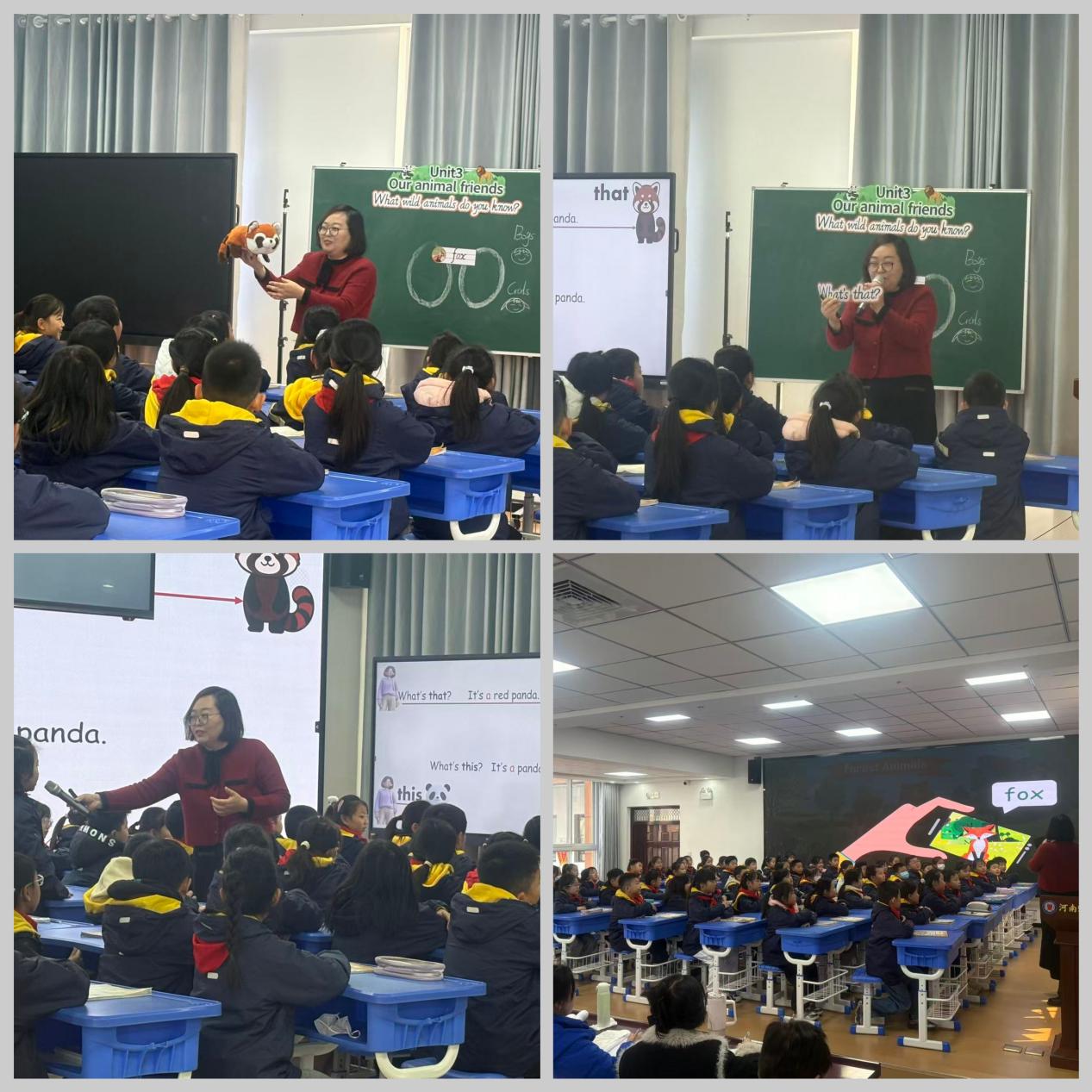 第三节课,李继敏老师与三(5)班孩子们共同展示了英语课《U3 Our animal friends》。课堂围绕“动物朋友”主题,创设热带森林、热带草原场景,通过歌曲、对话、角色扮演等丰富活动,营造出轻松愉悦的语言氛围。李老师注重语音渗透与句型操练,鼓励学生大胆表达,男生女生的大PK,把课堂气氛推向了高潮,在真实的语言运用中培养学生的交际能力与学习兴趣。