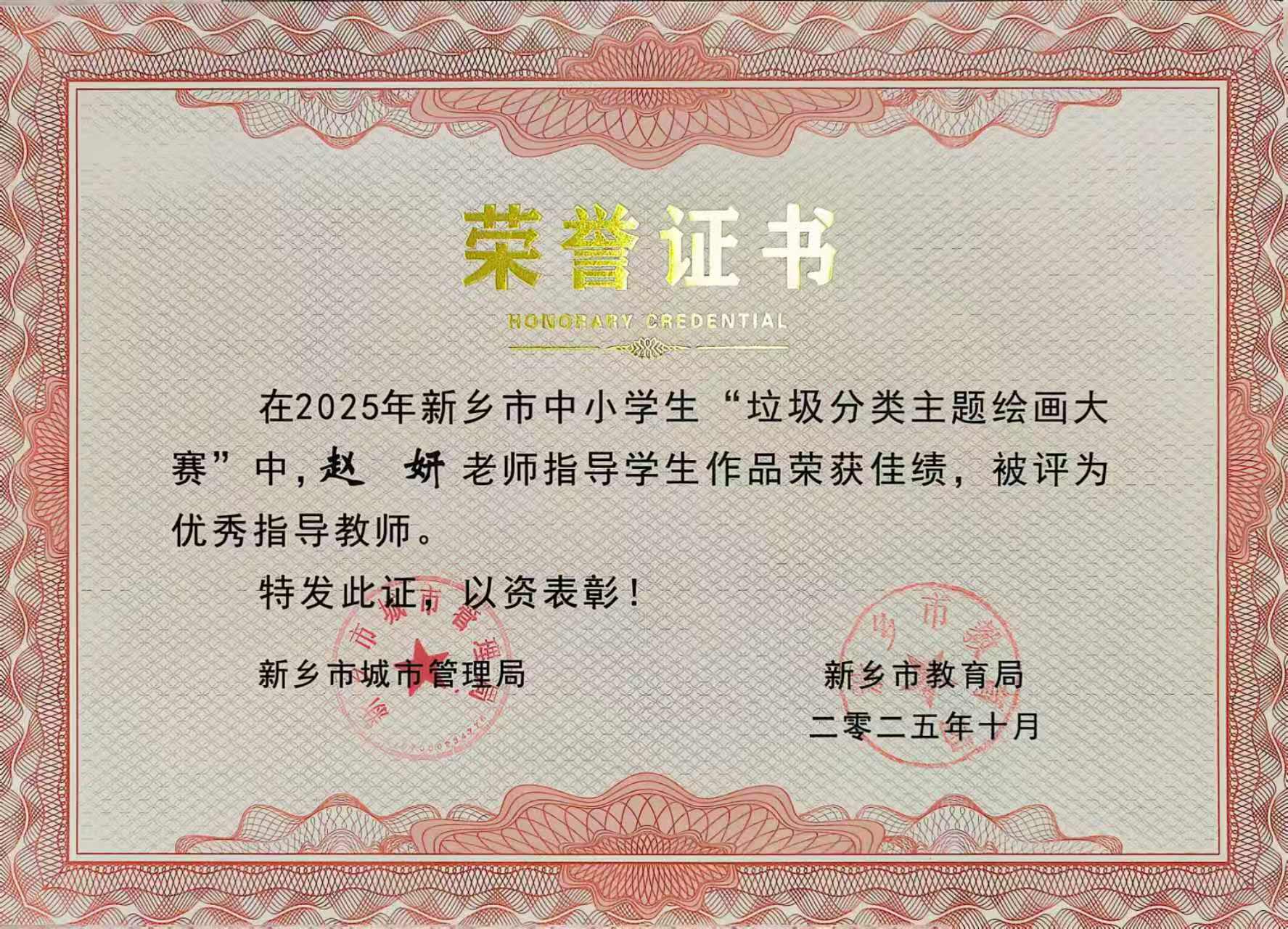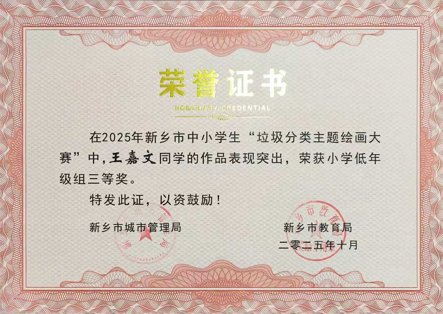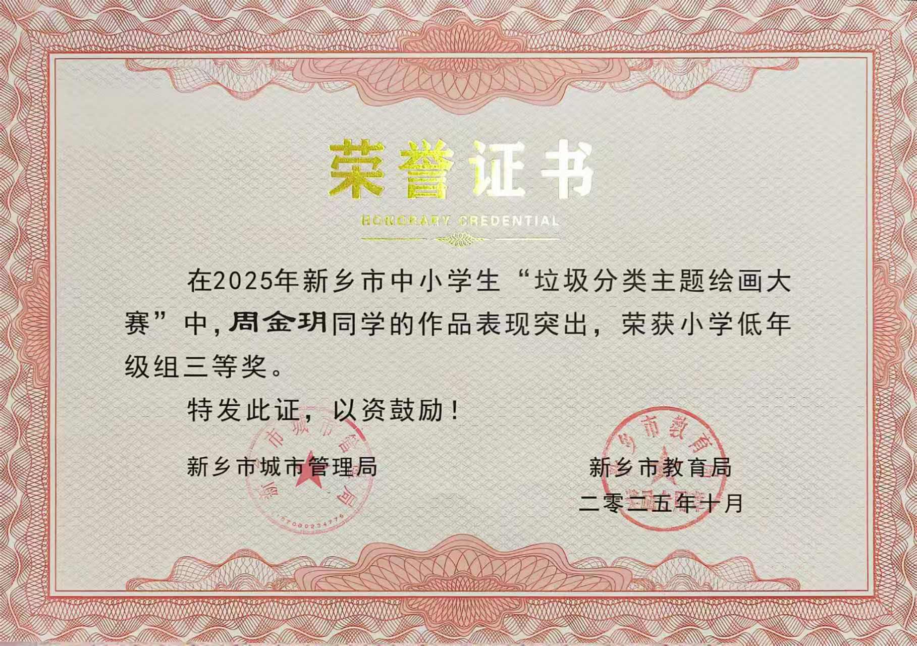 在2025年新乡市中小学生"垃圾分类主题绘画大赛"中,赵婧睿同学的作品表现突出,荣获小学低年级组二等奖,王嘉文、周金玥同学作品荣获小学低年级组三等奖,赵妍老师被评为优秀指导教师。