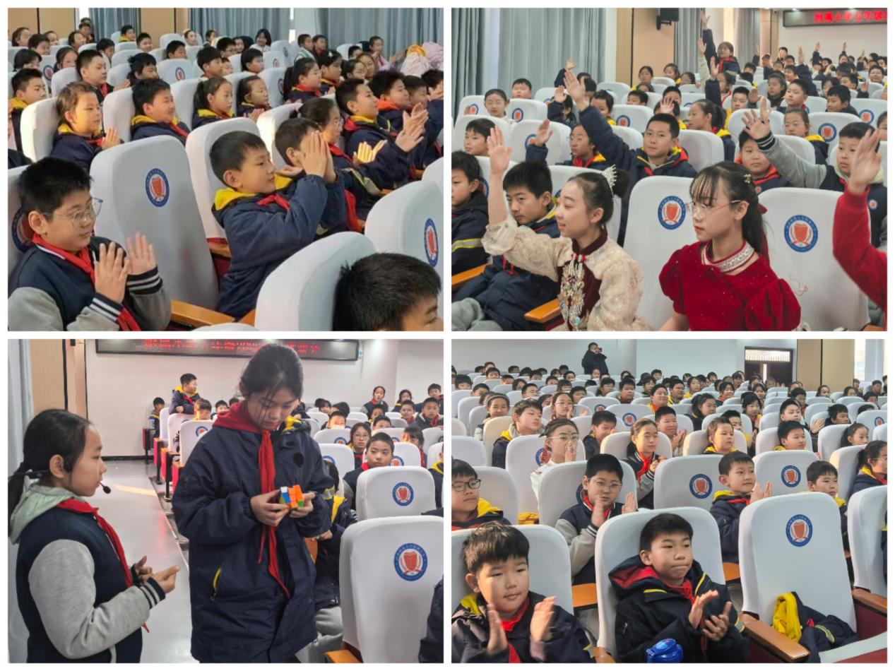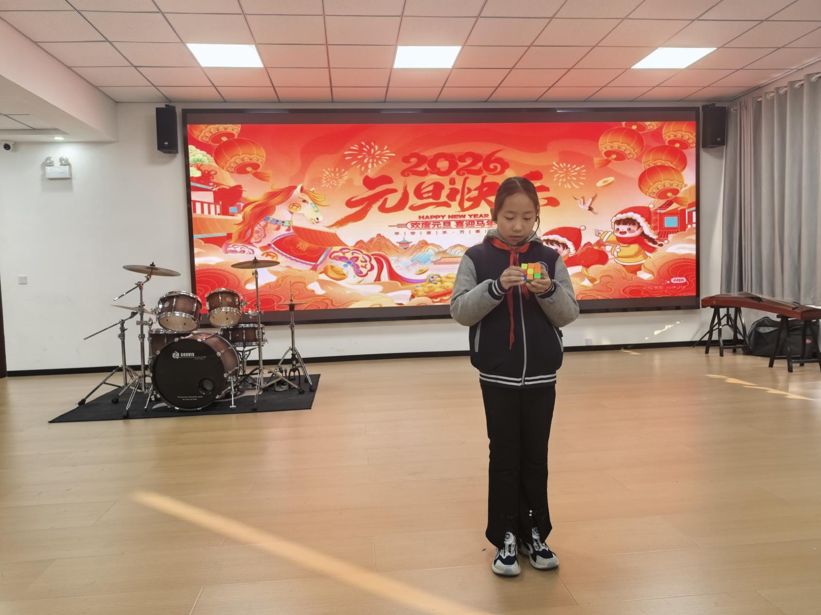 五(2)班张宇书同学的《魔方秀》令人叹服,眼花缭乱的手速搭配巧妙的公式转换,让杂乱的魔方在瞬息间焕颜归位,引来台下阵阵惊呼。