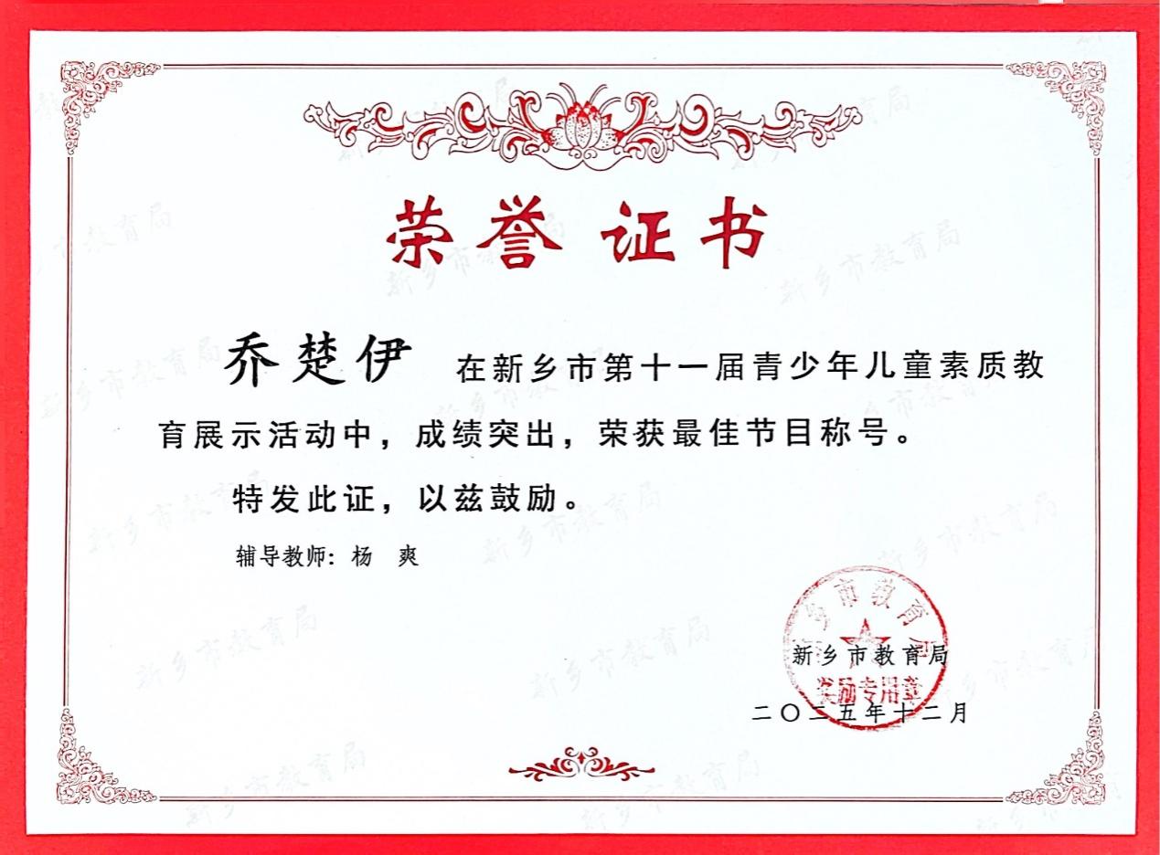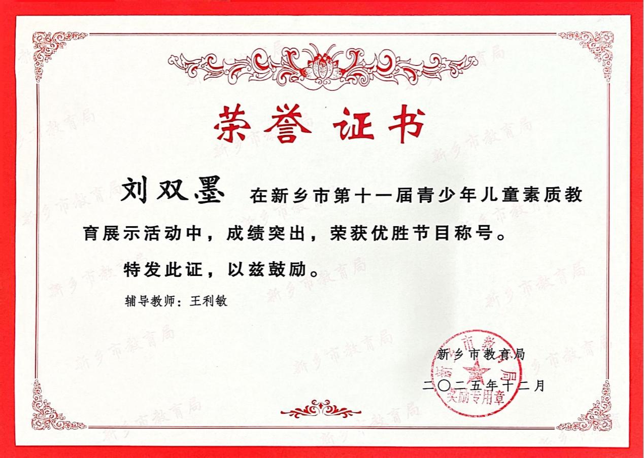 在新乡市第十一届青少年儿童素质教育展示活动中,我校学子凭借扎实的素养与出色的表现,在众多参赛选手中脱颖而出,斩获多项荣誉,充分展现了学校素质教育的丰硕成果与学子们的卓越风采。