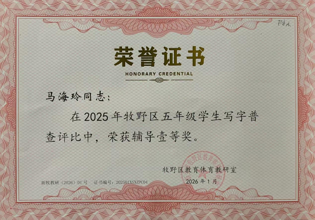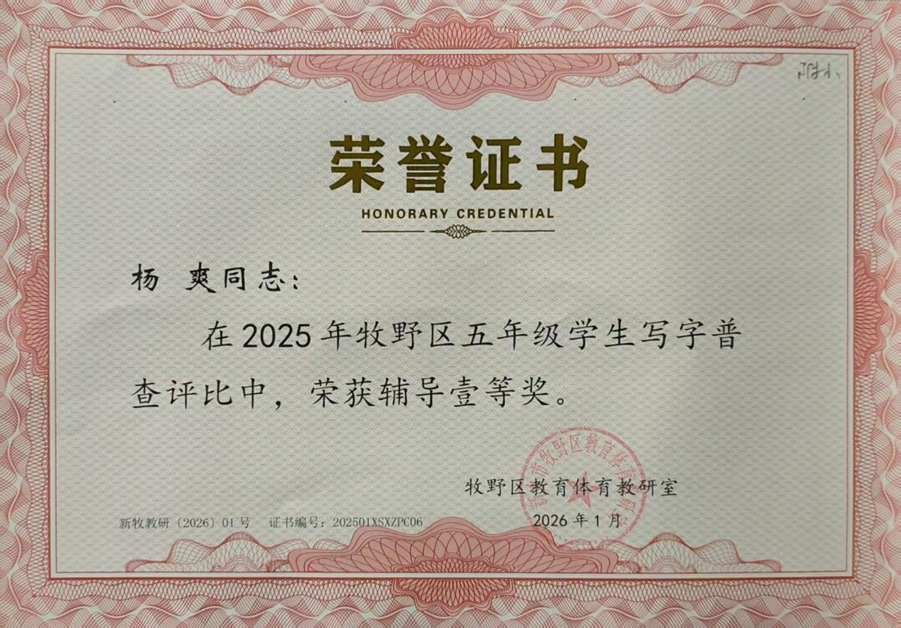 2026年1月开展的牧野区五年级学生写字普查评比中,我校学生凭借规范的书写、整洁的卷面表现突出,马海玲老师、杨爽老师荣获一等辅导奖。