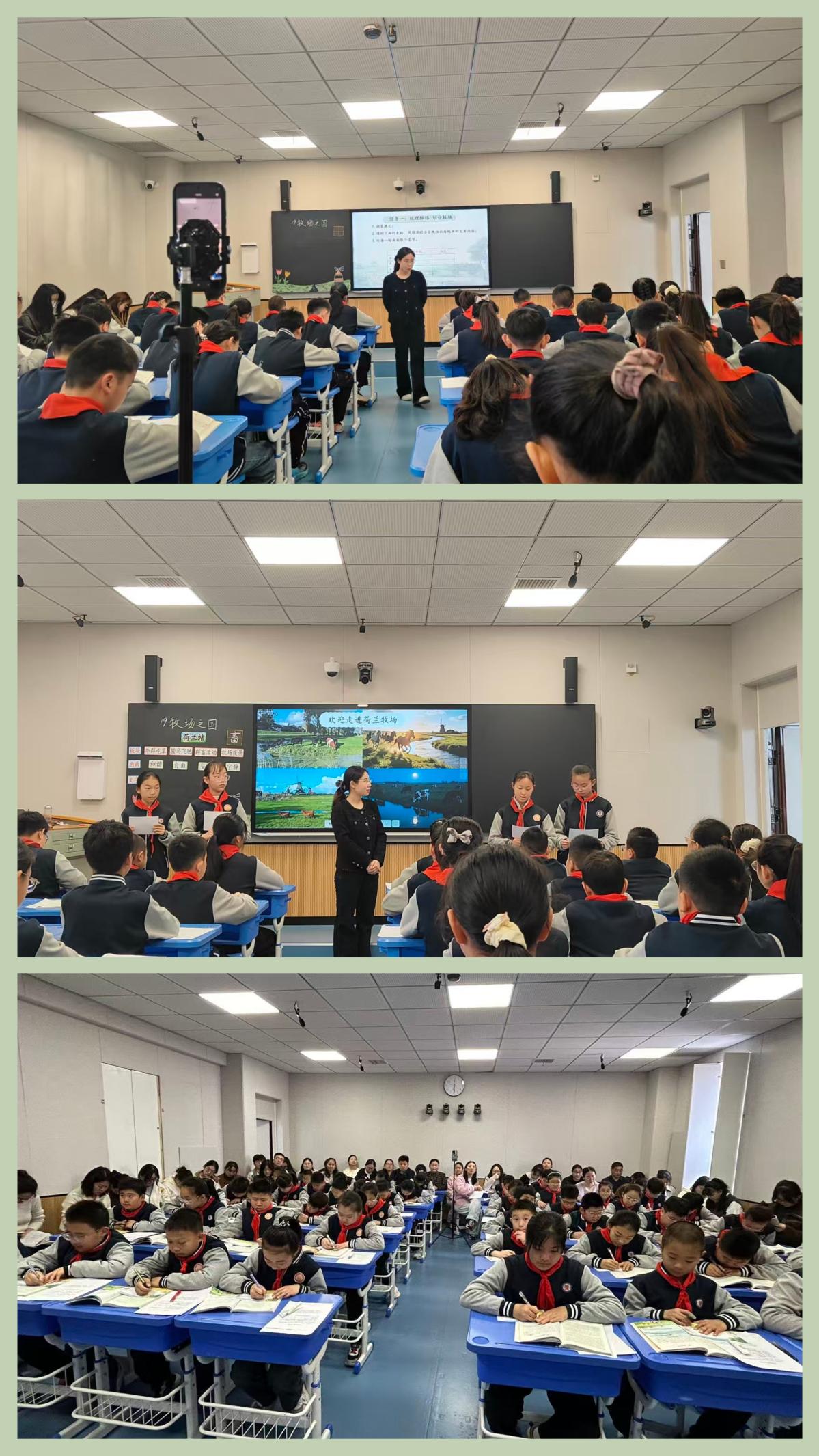 第二节,孟珍老师为五(1)班学生带来《牧场之国》。她以“跟着文字去旅行”导入,设计梳理脉络、品读内涵、书写盛景三个递进任务,注重方法指导,引导学生读悟结合、读写结合,课堂思维火花频发。