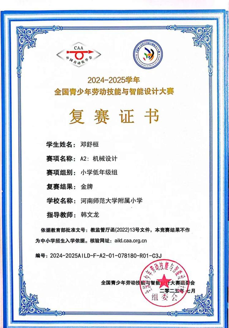 在全国青少年劳动技能与智能设计大赛、世界机器人大会青少年机器人设计与信息素养大赛等国家级、市级科创赛事中我校学子大放异彩,凭借扎实的知识储备和出色的实践创新能力,斩获多项大奖,尽显附小学子的科创风采。本次参赛的多项赛事规格高、竞争激烈,吸引了全国各地的优秀青少年队伍同台比拼。备赛阶段,我校参赛队员在指导老师的带领下,牺牲课余时间,从方案构思、模型搭建到程序调试,每一个环节都反复打磨、精益求精。团队成员分工协作、默契配合,攻克了一个又一个技术难题,为比赛做好了充分准备。比赛现场,选手们沉着应战、自信展示。面对复杂的赛题和严格的评审要求,他们灵活运用编程、机械设计等知识,有条不紊地完成作品操作与现场答辩。新颖的创意构想、流畅的实践演示、清晰的逻辑表达,赢得了评委们的一致好评,最终在多类项目中脱颖而出,摘得荣誉。此次获奖是河南师大附小坚持“五育并举”、深耕科创教育的生动成果。长期以来,学校积极开设编程、机器人等科创特色课程,举办校园科技节、创客作品展等丰富活动,为学生搭建起实践创新的广阔平台。未来,学校将继续深化科创教育,助力更多少年在科学探索的道路上勇攀高峰,成长为兼具科学素养与创新能力的