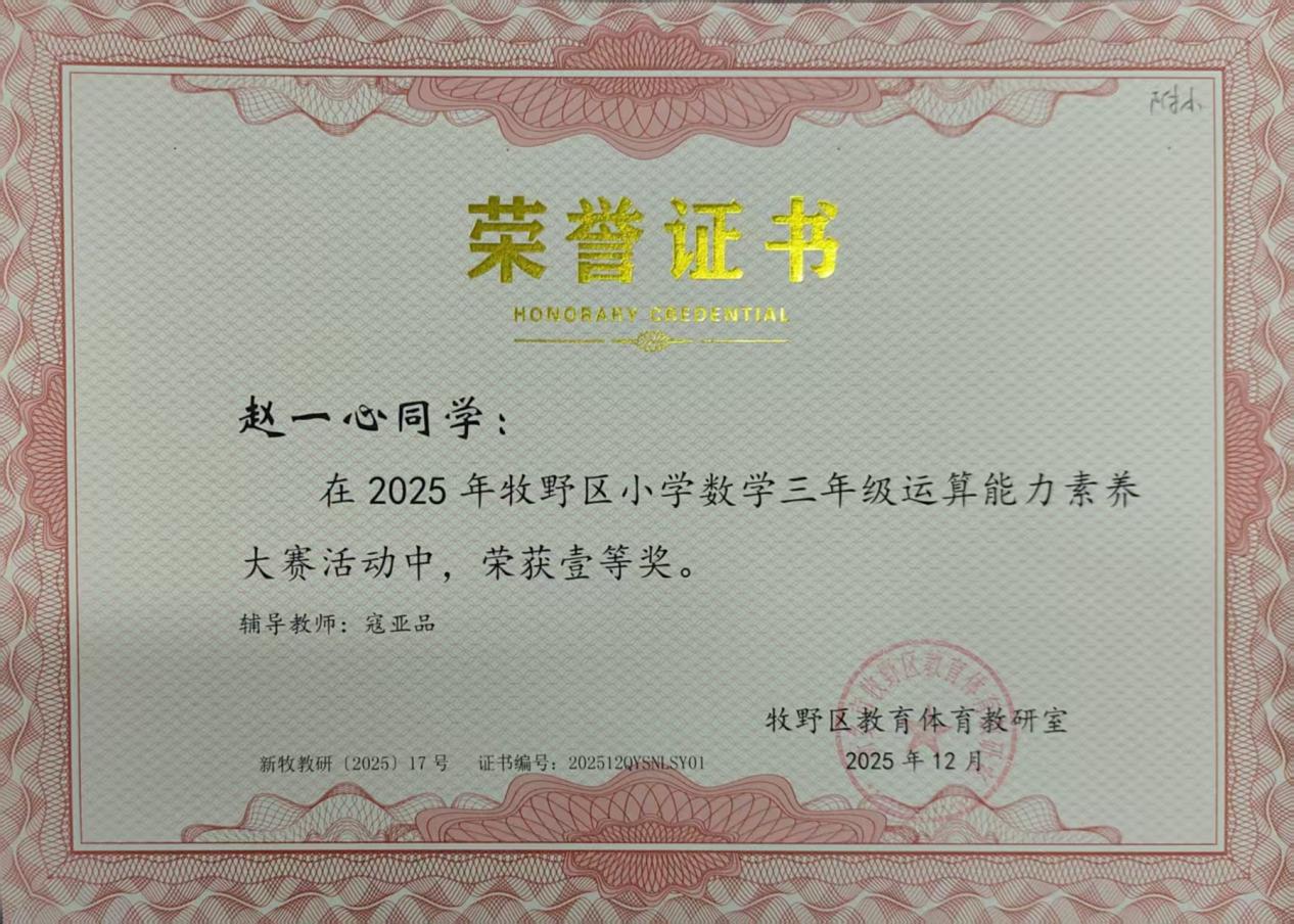 2025年12月,在牧野区小学数学三年级运算能力素养大赛中,我校选派的14位参赛同学中,13人获奖。获得一等奖的有8位同学,分别是:赵一心李沐宸闫家淇 闫聿乔 赵晨昕 潘一诺 刘博涵 王懋源获得二等奖的有5位同学,分别是:杜羿 孙宇昂 王若瑜张思骋 汤智凯(教导处)
