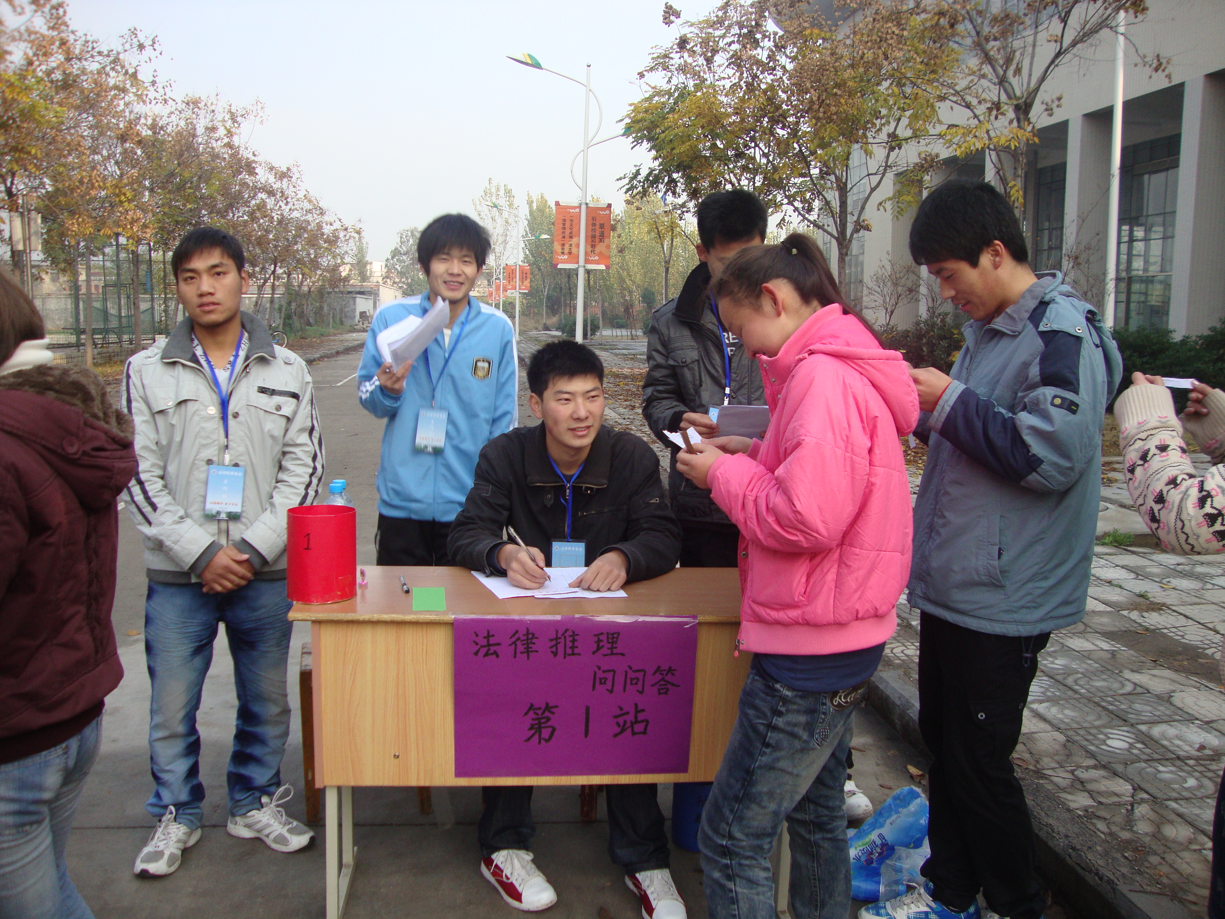 本次活动旨在考查大一新生的法律知识及对校园布局的了解程度,使同学们在娱乐中学习法律,在实践中逐步成长。整个活动分为五个站区,各站区分别设置专门接待人员,其中站区的名字以五个小谜语开启,如“大学之道刻于石上”、“欧阳醉翁心仪之处 翼然而临于湖上”等,增加了活动的娱乐性。十七个院的选手各自佩戴体现本队风格的徽章,热情洋溢,踊跃参加。队伍由“出发点”站开始,在每站答题后,得到下一站的谜语,并开始寻找下一站的答题位置,直至到达第五站。比赛过程充满挑战,综合考验了同学们的脑力、体力以及心理素质。整个活动现场,每一站都会看到选手匆忙而认真答题,记分员干练出题、积极缓解选手情绪的身影。经过激烈的角逐,最终法学院、文学院、经济与管理学院以优异的成绩,取得了本次活动的前三甲。