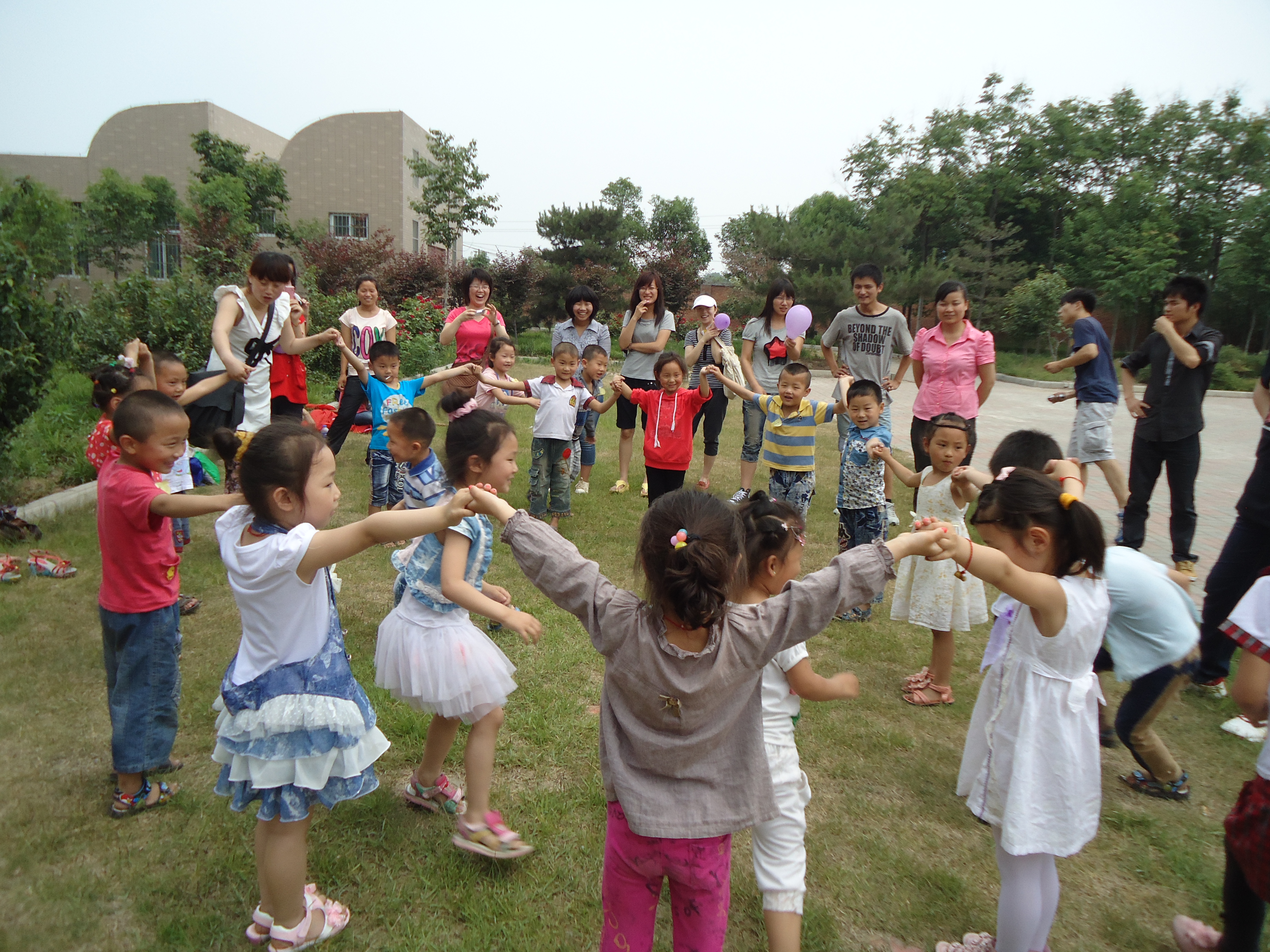 下午时分,在同学们的带领下,孩子们首先来到了我校东区。站各式各样的建筑,宽敞明亮的多媒体教室,蓊蓊郁郁的树木,学校的风采让小朋友们感叹不已。同学们的介绍精彩详细,从学校东区到西区,从教室到食堂,天真和童趣洋溢在每个人的脸庞。参观完毕,国政班同学组织孩子们玩起了“猫逮老鼠”,他们手牵着手形成一个个的鼠洞,大圆圈里面藏匿着几只蹿来蹿去的“老鼠”,外面数只“花猫”忽隐忽现,忽左忽右,洞中的老鼠时不时探出脑袋,而躲在角落的猫早已做好了向前捕捉的准备,辅导员也和大家打成一片…可爱的孩子们似乎就是动画世界的主角,欢乐的笑声此起彼伏。炙热的阳光晒得他们小脸通红,却挡不住他们的活泼与热情。