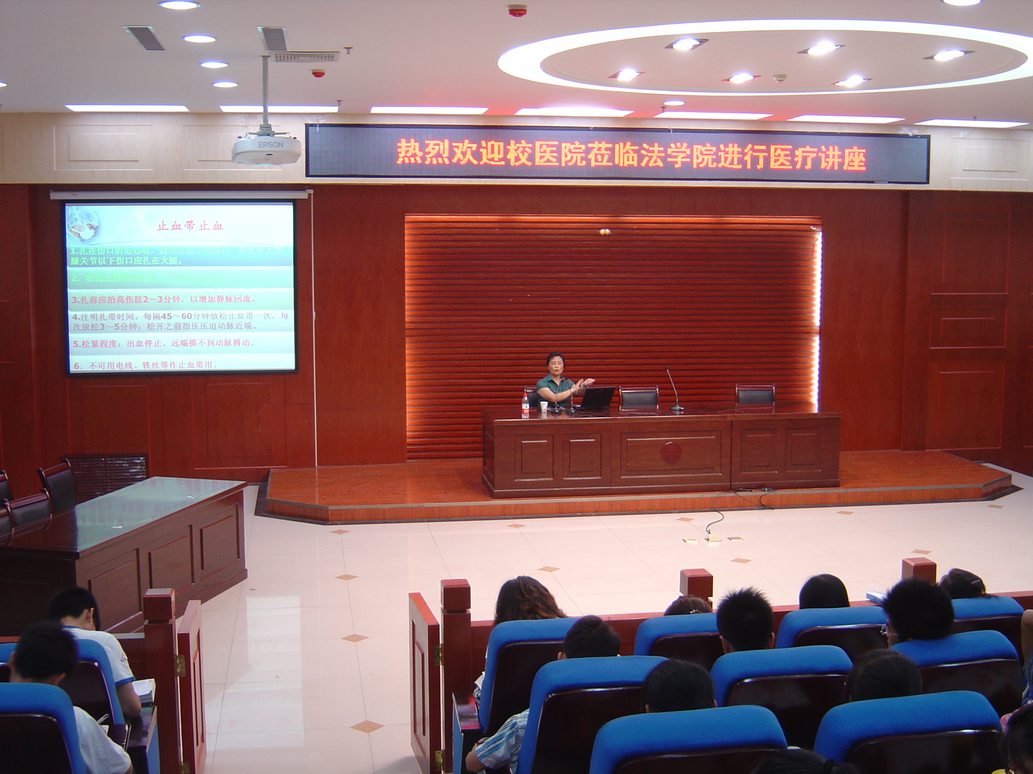 为促进校医院与师生的沟通与交流,增加大家对创伤急救的知识,6月6日晚,校医院莅临模拟法庭进行医疗讲座。出席本次活动的有校医院中医副主任医师余孟兰、校医院护师刘鹏淑、校医院医保办工作人员赵丹丹。本次会议由法学院2011级辅导员左红娟主持,法学院各级同学积极参加。